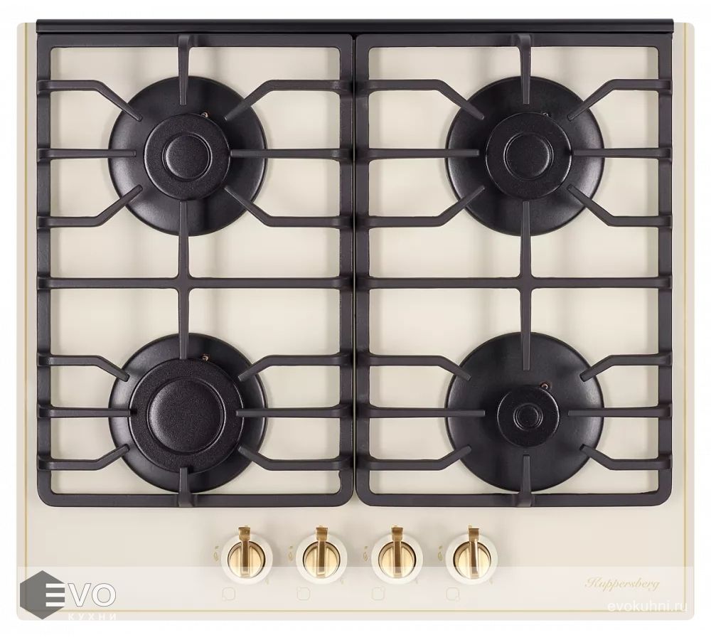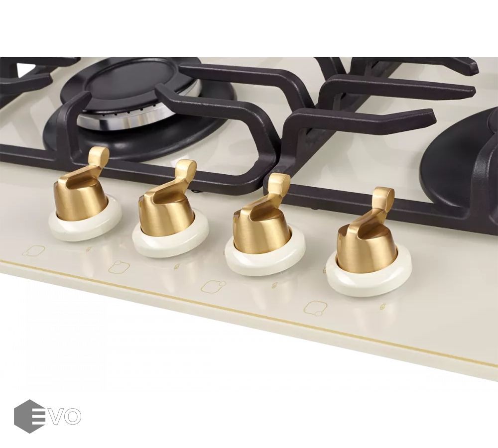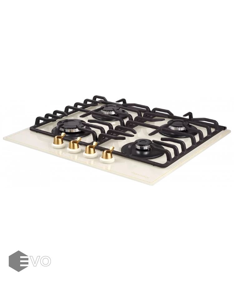 Газовая варочная поверхность, закаленное стекло, ширина 60 см, 4 газовые конфорки, автоподжиг, газ-контроль, чугунные решетки, цвет бежевый/поворотные переключатели цвета бронзы.