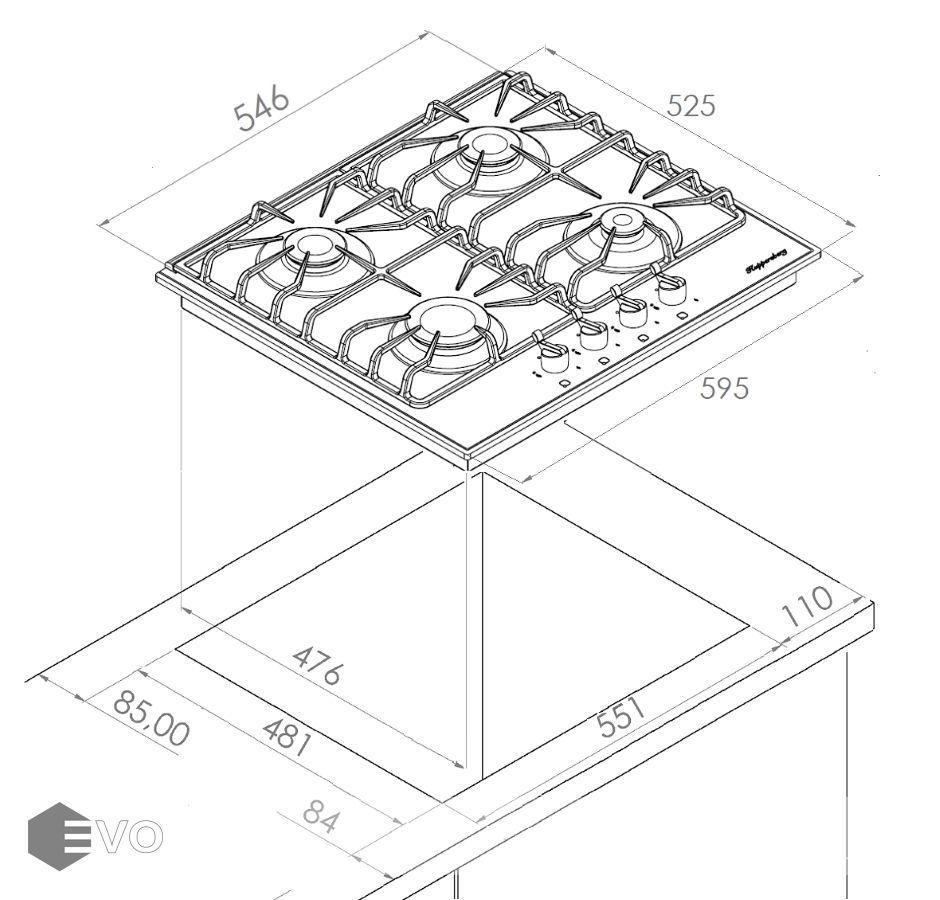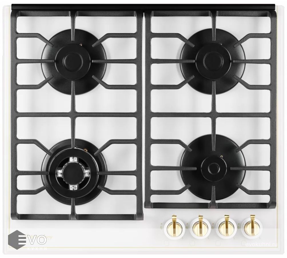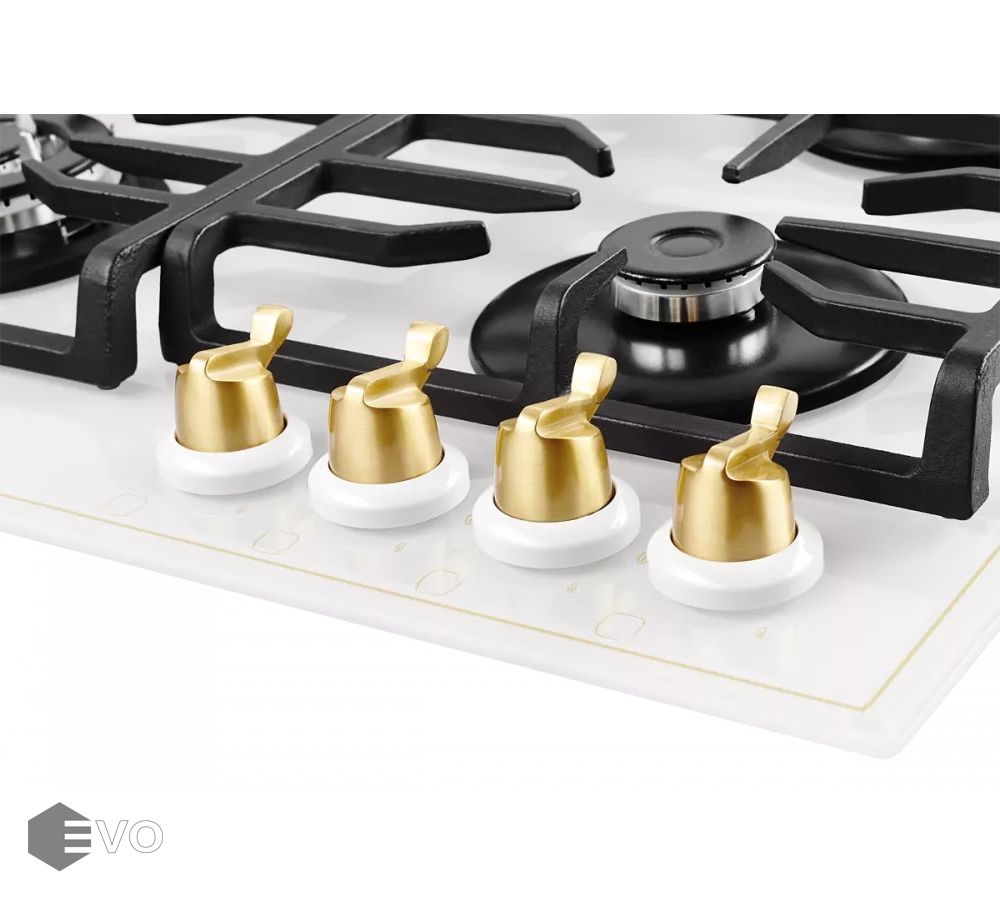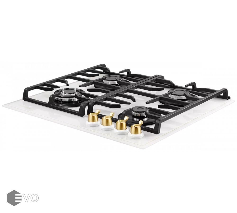 Газовая варочная поверхность, закаленное стекло, ширина 60 см, 4 газовые конфорки, WOK конфорка (2,5 кВт), автоподжиг, газ-контроль, чугунные решетки, поворотные переключатели цвета бронзы.