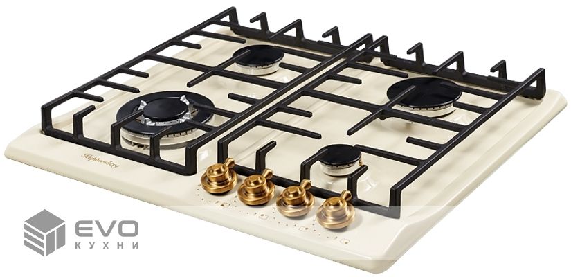 Газовая варочная поверхность металл, ширина 60 см, 4 газовые конфорки, 1 конфорка повышенной мощности, автоподжиг, газ-контроль, чугунные решетки, цвет бежевый/ручки цвета бронзы. Варочные поверхности покрытые эмалью имеют глубину цвета, а также приятные и гладкие на ощупь. Современные технологии эмали позволяют создать материал стойкий к нагреву и устойчивый к износу и по этим причинам эмалированные варочные поверхности, не только красивы, но и практичны в применении и уходе.