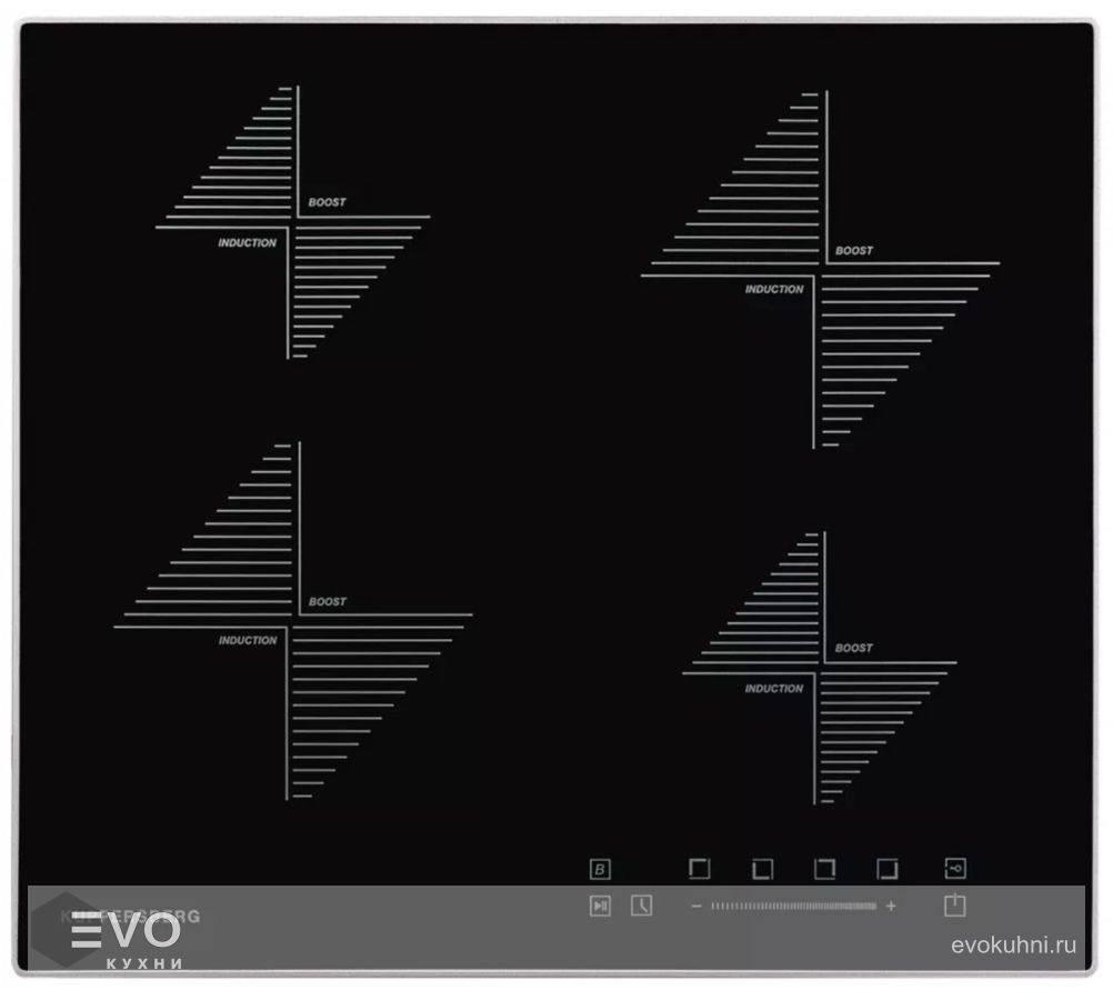 - СЛАЙДЕР. Удобное управления одним пальцем без повторных нажатий. Легко и просто передвигая палец вы настраиваете мощность нагрева конфорки. Экономит время и помогает в готовке.