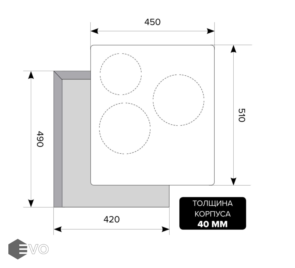 - Одноконтурная конфорка (R1, R3): 2 х 1800 Вт (Ø 190 мм)
