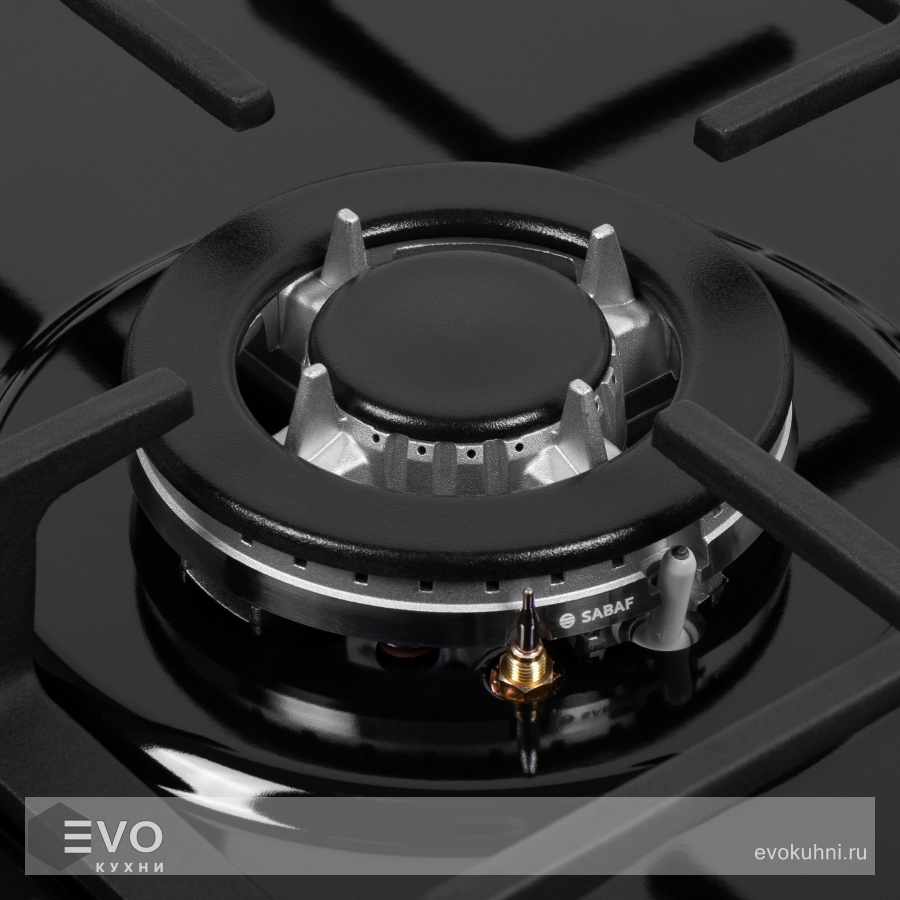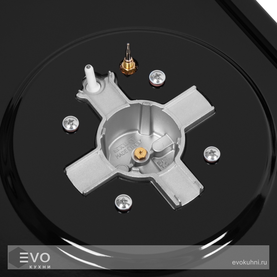 Панель выполнена из высококачественной нержавеющей стали, покрытой прочной эмалью. В данной модели установлены итальянские горелки SABAF. Две стандартные конфорки мощностью 1000 Вт, 1700 Вт и одна мощная WOK-конфорка с двойным пламенем мощностью 3000 Вт. Регулирование подачи газа и электроподжиг конфорок происходит с помощью поворотных ручек из высокопрочного термостойкого пластика. Для простоты использования около каждой ручки нанесены информационные изображения: используемая конфорка, подача газа выключена, электроподжиг, максимальное пламя и минимальное пламя.