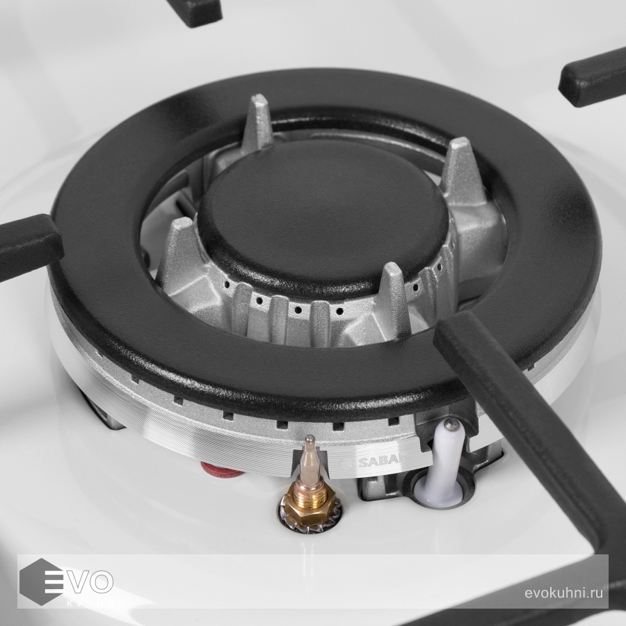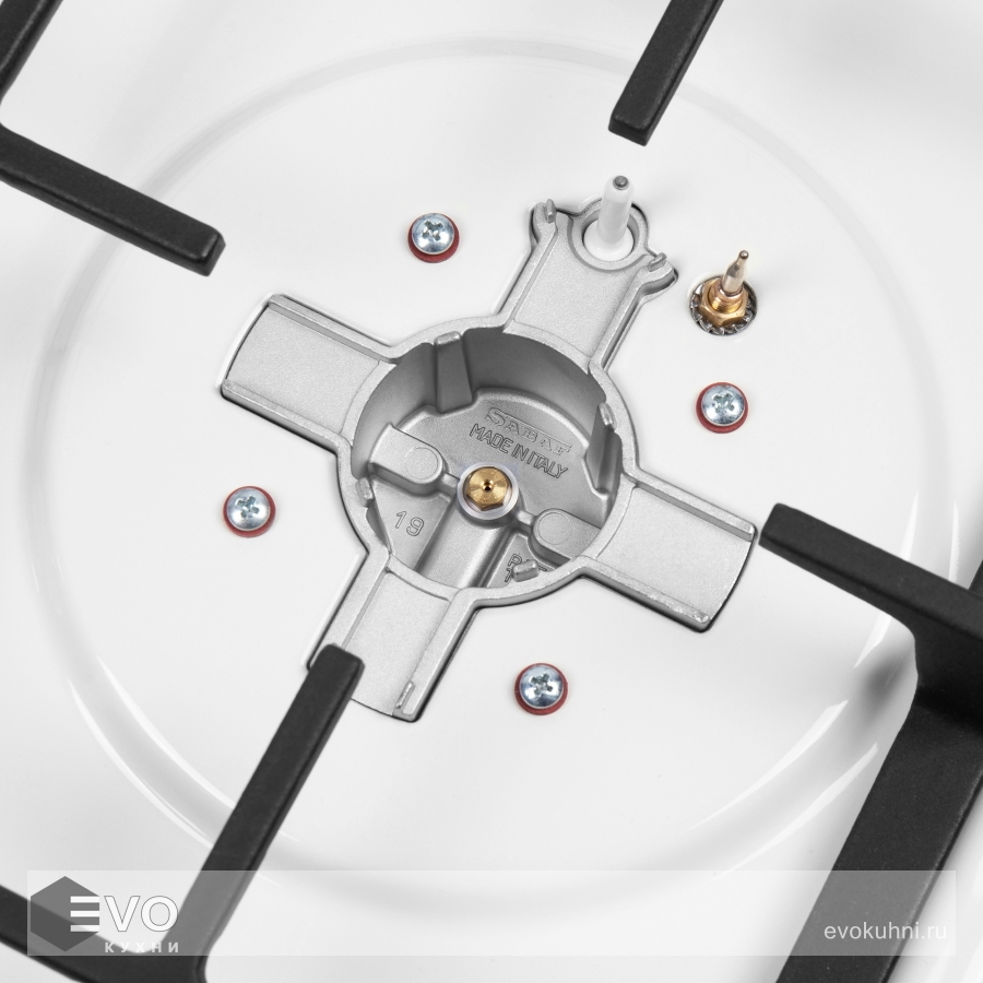 Панель выполнена из высококачественной нержавеющей стали, покрытой прочной эмалью. В данной модели установлены итальянские горелки SABAF. Две стандартные конфорки мощностью 1000 Вт, 1700 Вт и одна мощная WOK-конфорка с двойным пламенем мощностью 3000 Вт. Регулирование подачи газа и электроподжиг конфорок происходит с помощью поворотных ручек из высокопрочного термостойкого пластика. Для простоты использования около каждой ручки нанесены информационные изображения: используемая конфорка, подача газа выключена, электроподжиг, максимальное пламя и минимальное пламя.