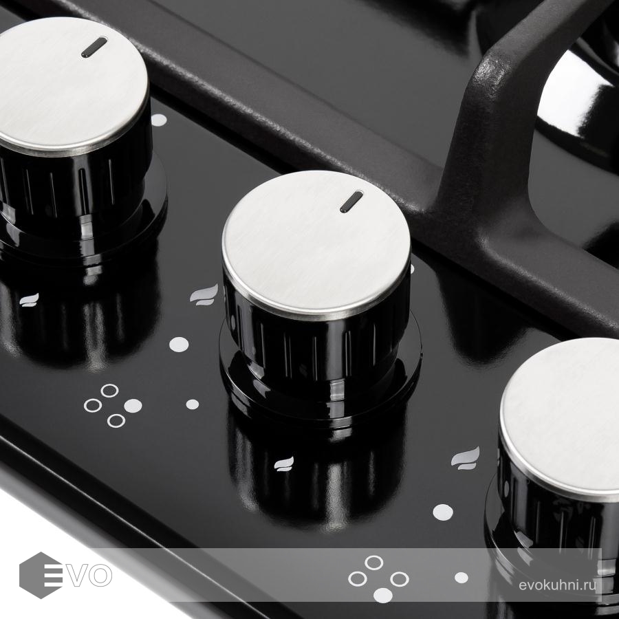 Регулирование подачи газа и электроподжиг конфорок происходит с помощью поворотных ручек из высокопрочного термостойкого пластика. Для простоты использования около каждой ручки нанесены информационные изображения: используемая конфорка, подача газа выключена, электроподжиг, максимальное пламя и минимальное пламя.