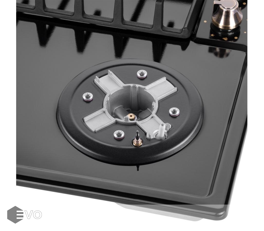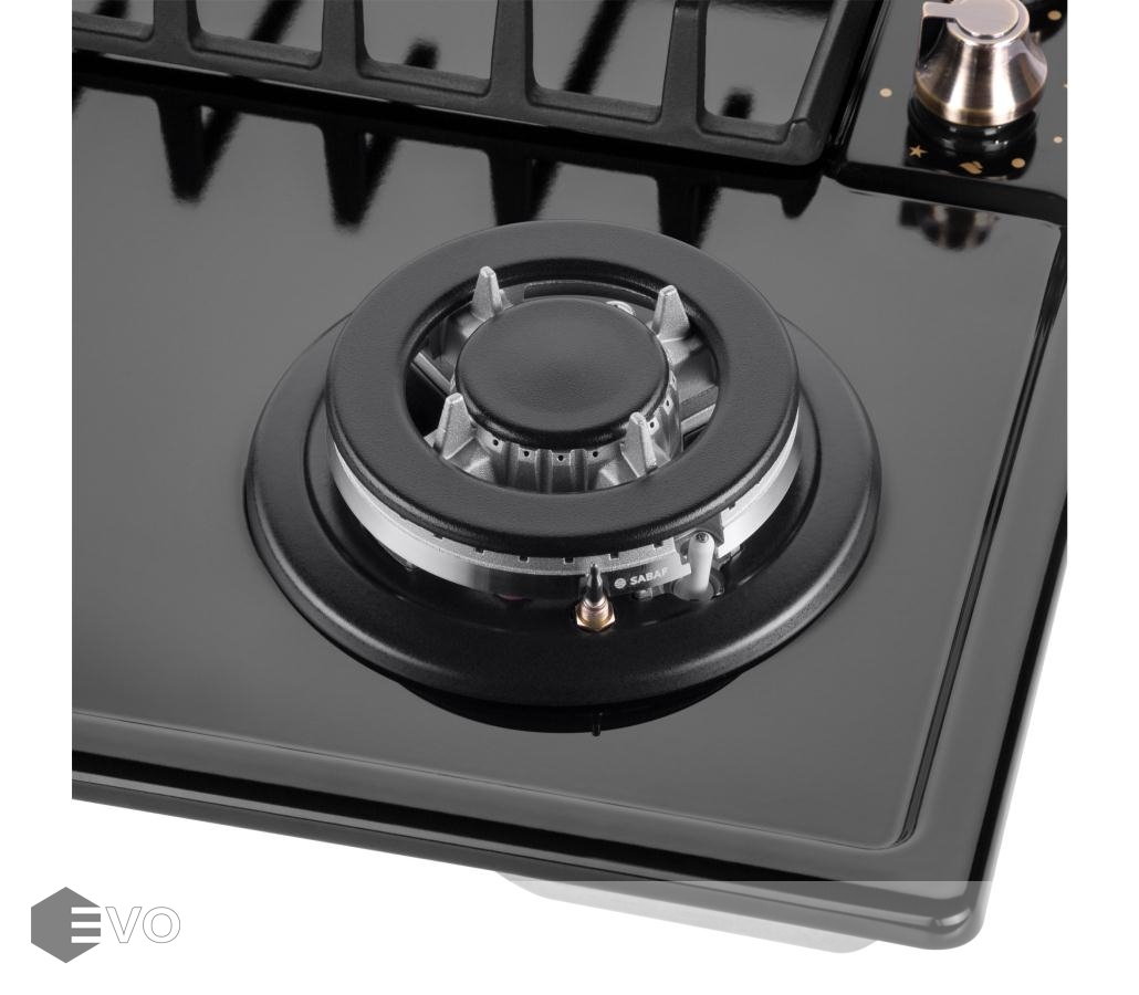 Панель выполнена нержавеющей стали с теплостойким покрытием из эмали. В данной модели установлены высококачественные итальянские горелки SABAF. Три стандартные конфорки мощностью 1000 Вт, 1700 Вт, 1700 Вт и 1 свермощная WOK-конфорка с двойным пламенем мощностью 3800 Вт.