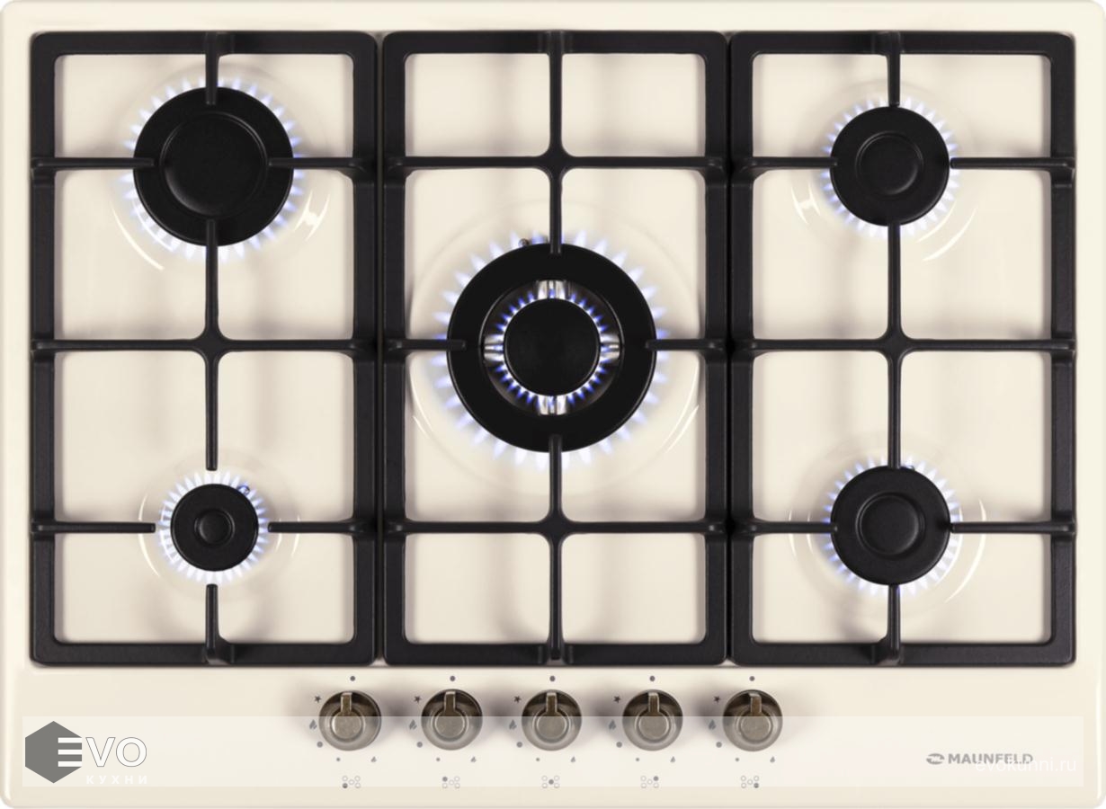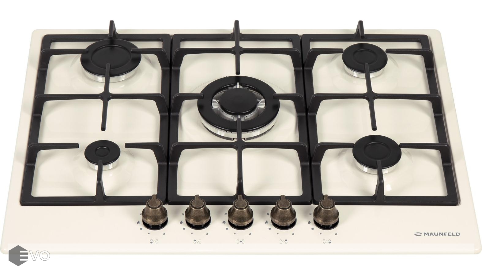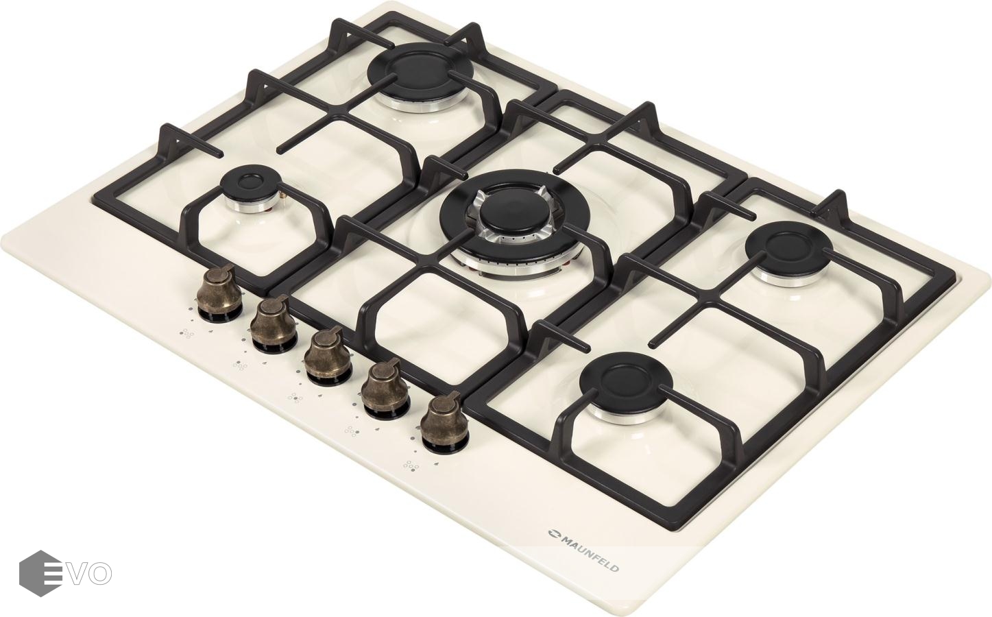 Газовая варочная поверхность MAUNFELD EGHE.75.33CBG2.R/G – 5-ти конфорочная встраиваемая газовая варочная панель шириной 70 см может работать от магистрального газа и газа в баллоне (тип G30), для этого достаточно поставить специальные жиклеры французской фирмы SOURDILLON, поставляющиеся в комплекте.