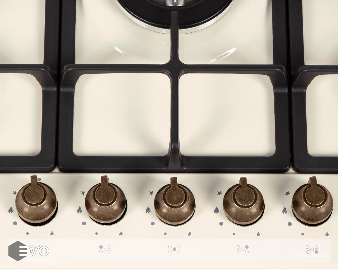 Управление подачей газа и поджигом конфорок происходит с помощью поворотных регуляторов - стильных цельнометаллических ручек цвета бронзы. Для простоты использования около каждой ручки нанесены информационные изображения: используемая конфорка, подача газа выключена, электроподжиг, максимальное пламя и минимальное пламя.