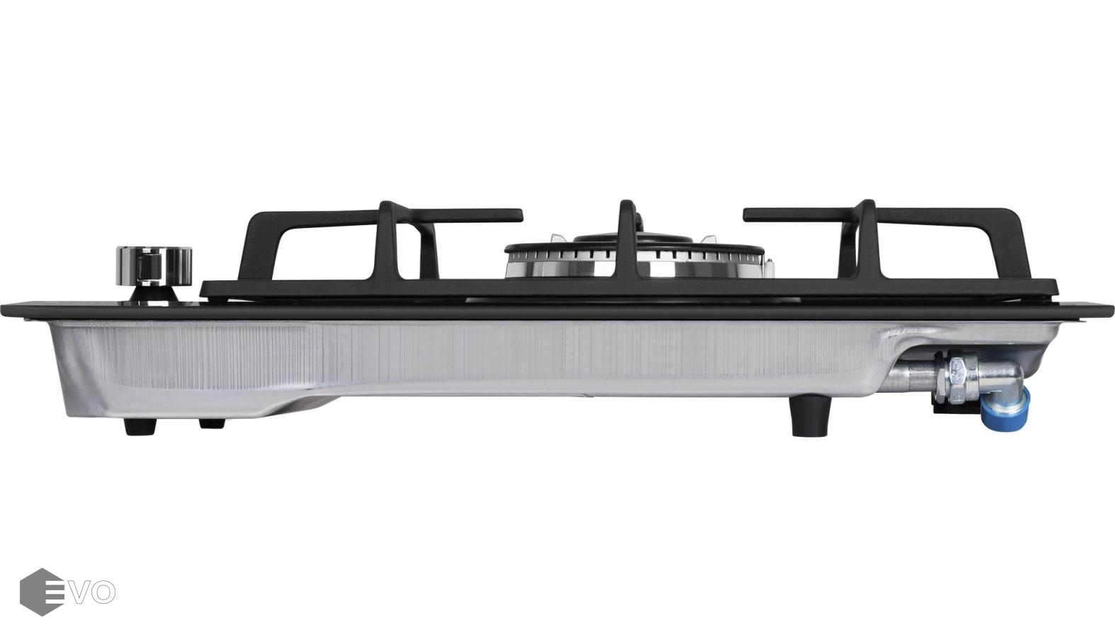 Панель выполнена из термостойкого черного стекла толщиной 8 мм и с фацетом по всему периметру. В данной модели установлена одна супермощная WOK-конфорка (3800 Вт) итальянского производства (Sabaf). Регулирование подачи газа и электоподжиг конфорок происходит с помощью поворотных цельнометаллических регуляторов. Для простоты использования около каждой ручки нанесены информационные изображения: используемая конфорка, подача газа выключена, электроподжиг, максимальное пламя и минимальное пламя.