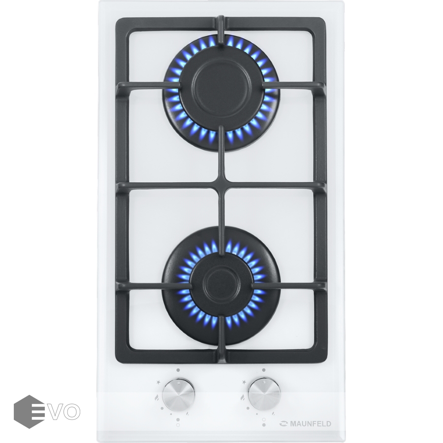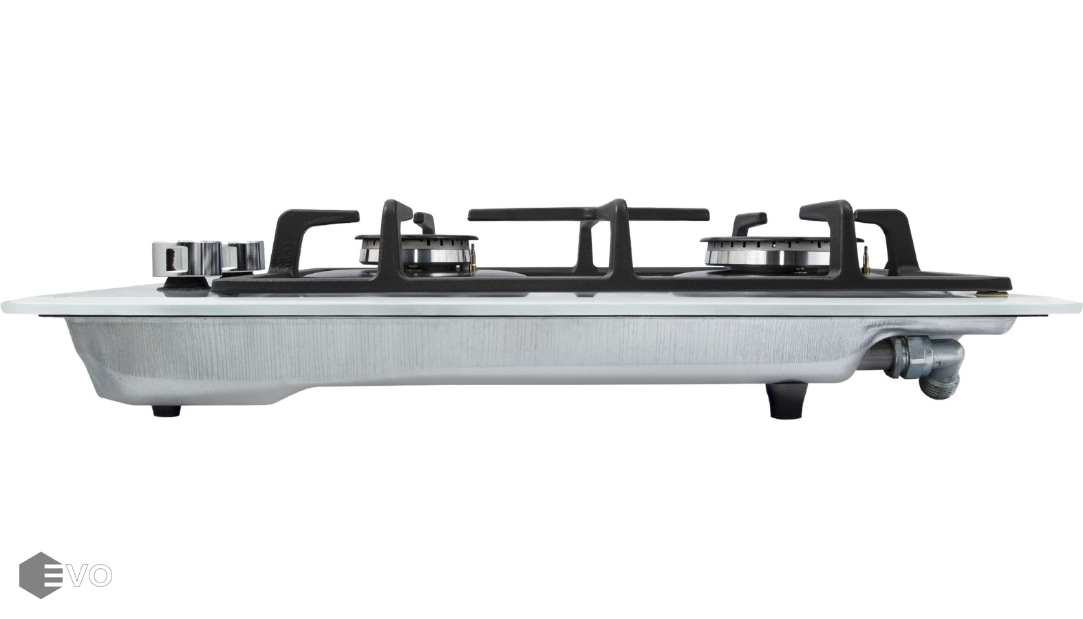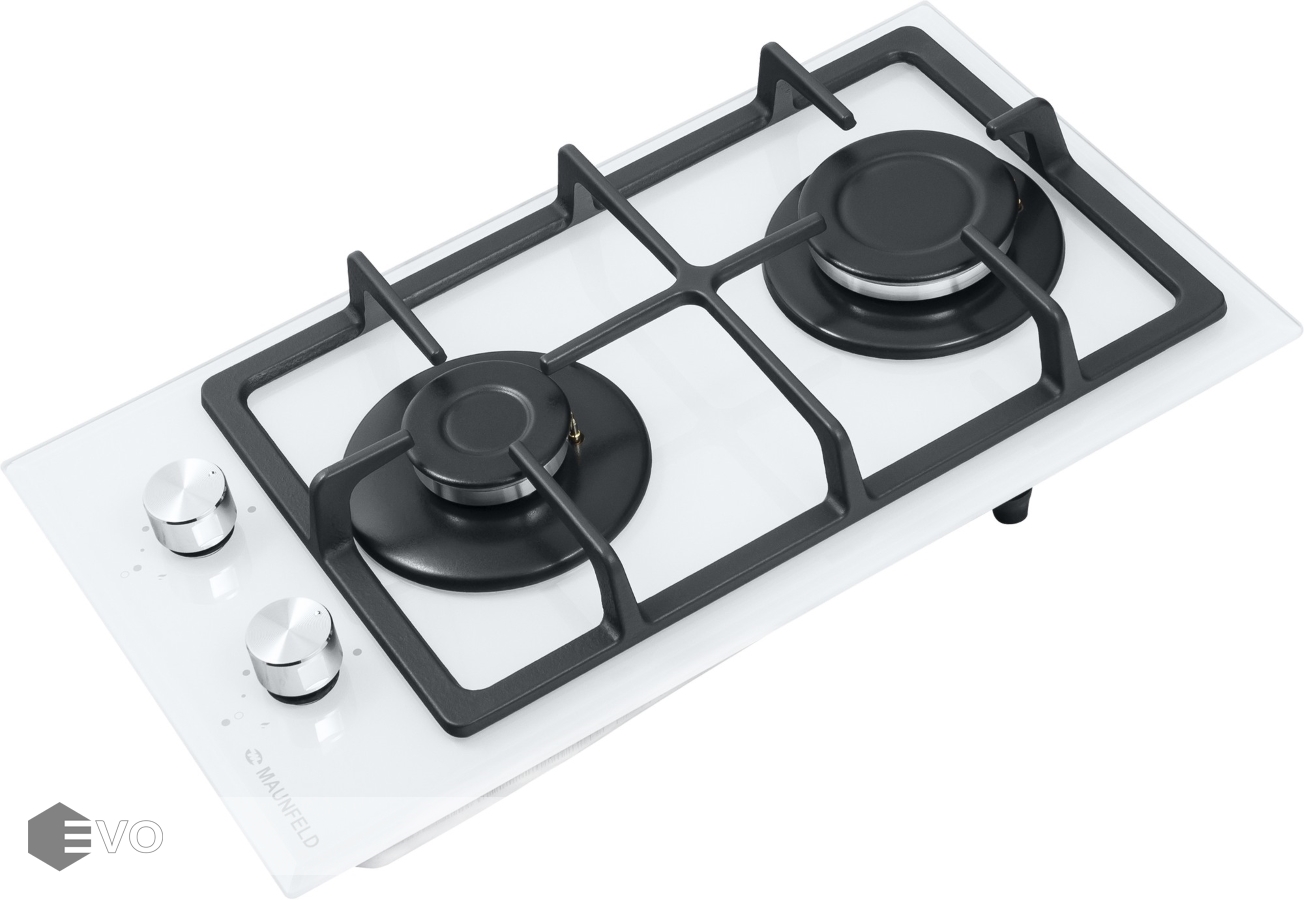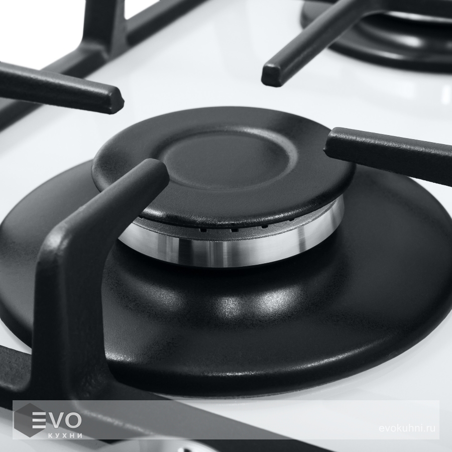 Панель выполнена из термостойкого стекла белого цвета толщиной 8 мм. В данной модели установлены высококачественные итальянские горелки SABAF. Две конфорки разного диаметра с мощностью 1700 Вт и 2600 Вт. Чугунная решетка, общая на две конфорки, выполнена таким образом, что не оставляет царапин на гладкой стеклянной поверхности. Регулирование подачи газа и электоподжиг конфорок происходит с помощью поворотных цельнометаллических ручек. Для простоты использования около каждой ручки нанесены информационные изображения: используемая конфорка, подача газа выключена, электроподжиг, максимальное пламя и минимальное пламя.