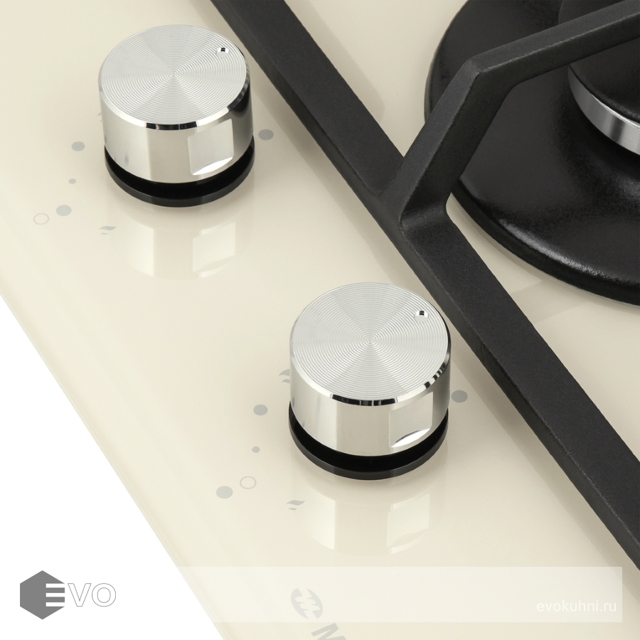 Регулирование подачи газа и электоподжиг конфорок происходит с помощью поворотных цельнометаллических ручек. Для простоты использования около каждой ручки нанесены информационные изображения: используемая конфорка, подача газа выключена, электроподжиг, максимальное пламя и минимальное пламя.