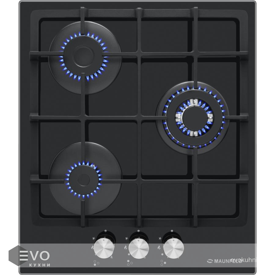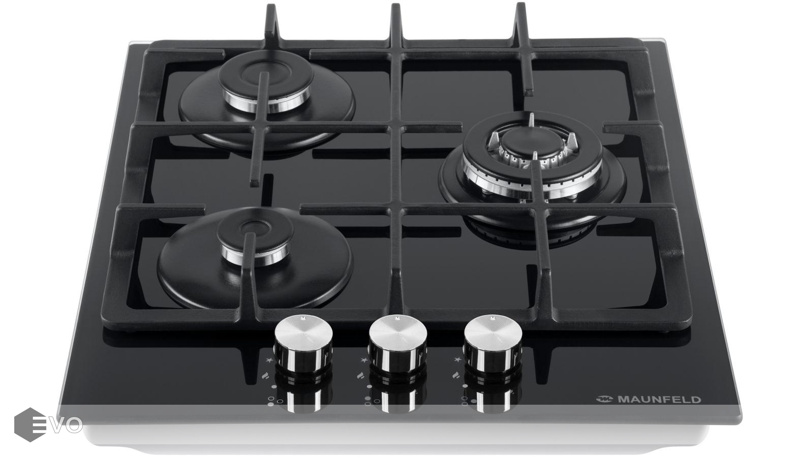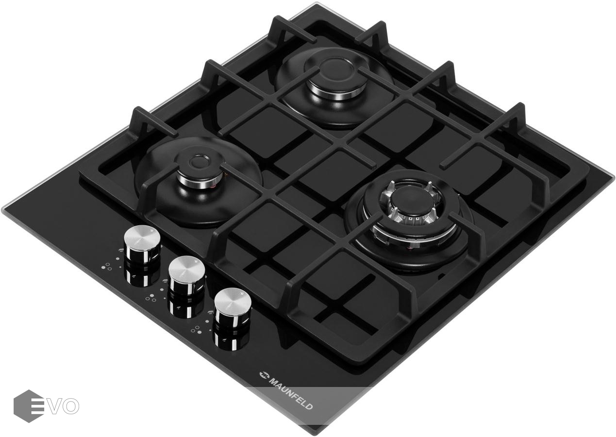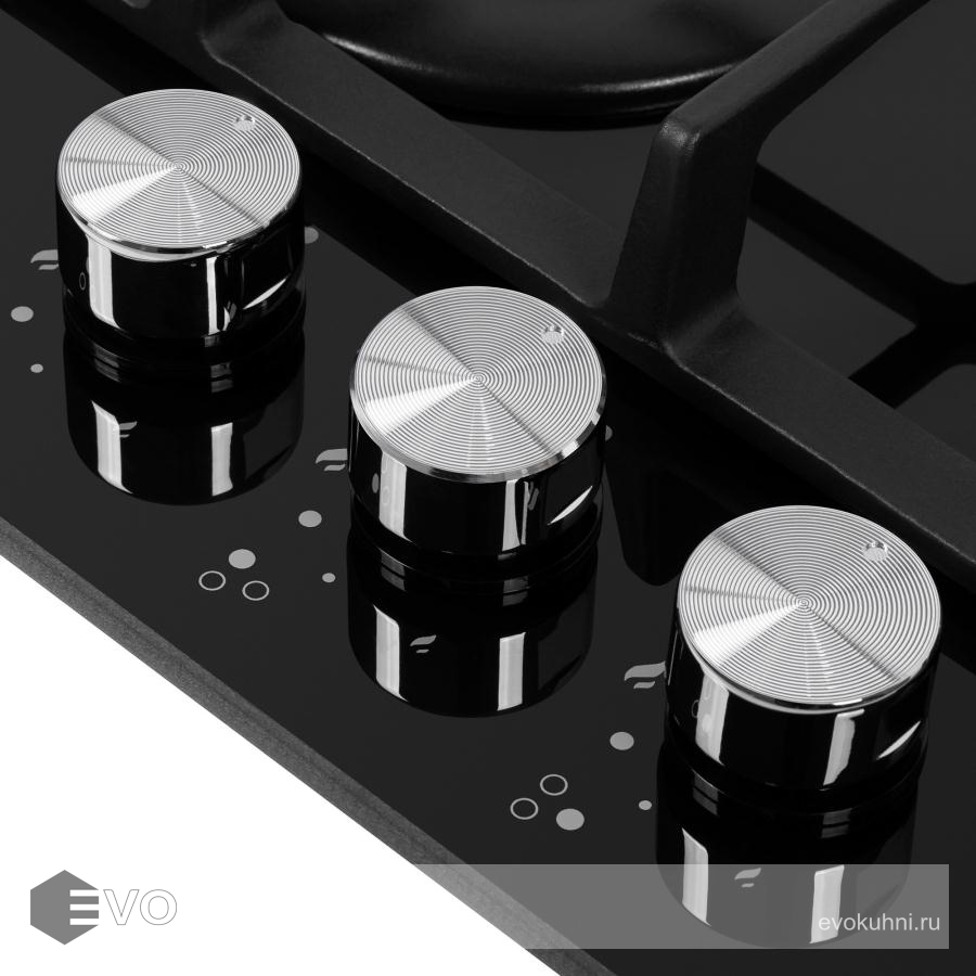 Панель выполнена из закаленного стекла черного цвета. В данной модели установлены итальянские горелки SABAF. Две стандартные конфорки мощностью 1000 Вт, 1700 Вт и одна мощная WOK-конфорка с двойным пламенем мощностью 3000 Вт. Они спроектированы таким образом, что огонь не перегревает ни чугунные решетки, ни ручки управления. Регулирование подачи газа и электроподжиг конфорок происходит с помощью поворотных цельнометаллических ручек. Для простоты использования около каждой нанесены информационные изображения: используемая конфорка, подача газа выключена, электроподжиг, максимальное пламя и минимальное пламя.