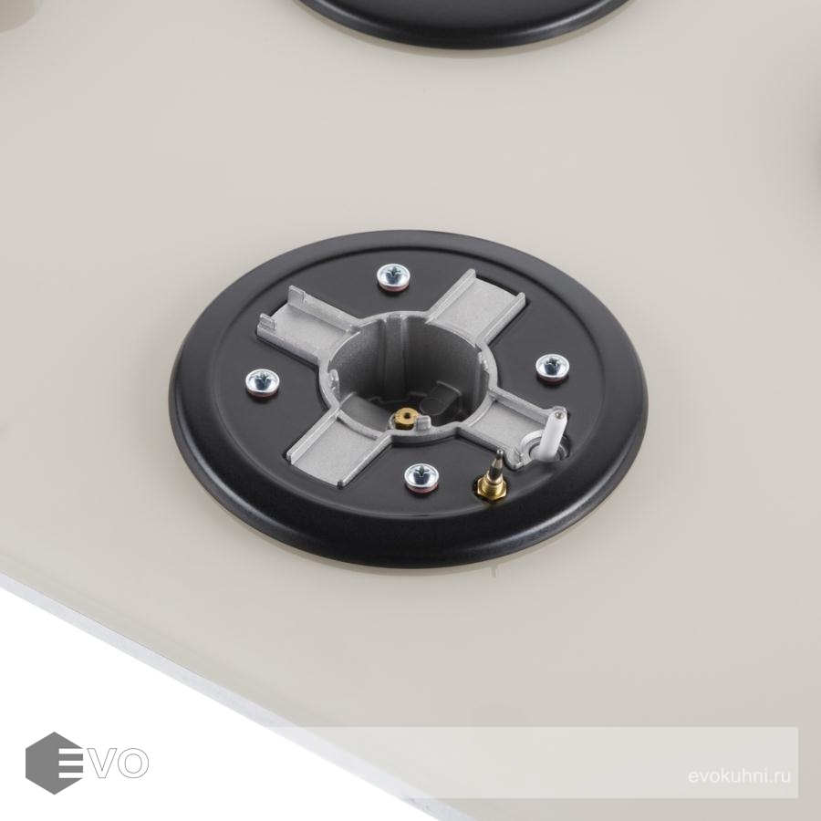 Панель выполнена из закаленного стекла бежевого цвета. В данной модели установлены итальянские горелки SABAF. Две стандартные конфорки мощностью 1000 Вт, 1700 Вт и одна мощная WOK-конфорка с двойным пламенем мощностью 3000 Вт. Они спроектированы таким образом, что огонь не перегревает ни чугунные решетки, ни ручки управления.