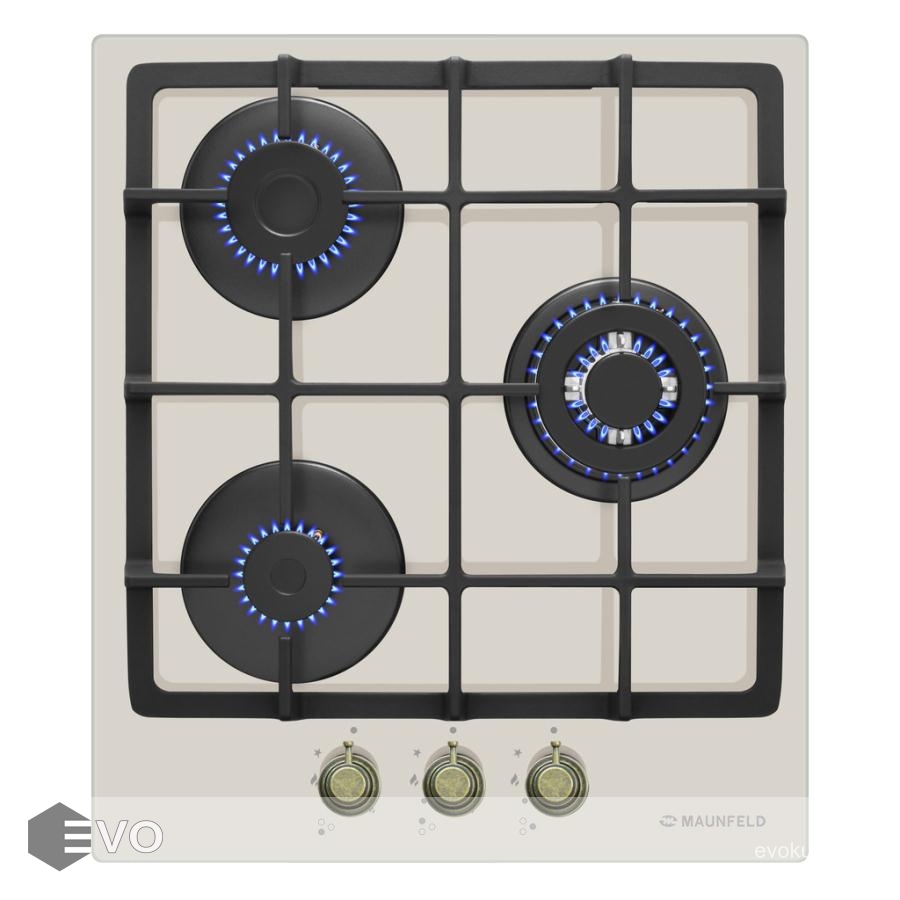 Панель выполнена из закаленного стекла бежевогоо цвета. В данной модели установлены итальянские горелки SABAF. Две стандартные конфорки мощностью 1000 Вт, 1700 Вт и одна мощная WOK-конфорка с двойным пламенем мощностью 3000 Вт. Они спроектированы таким образом, что огонь не перегревает ни чугунные решетки, ни ручки управления.