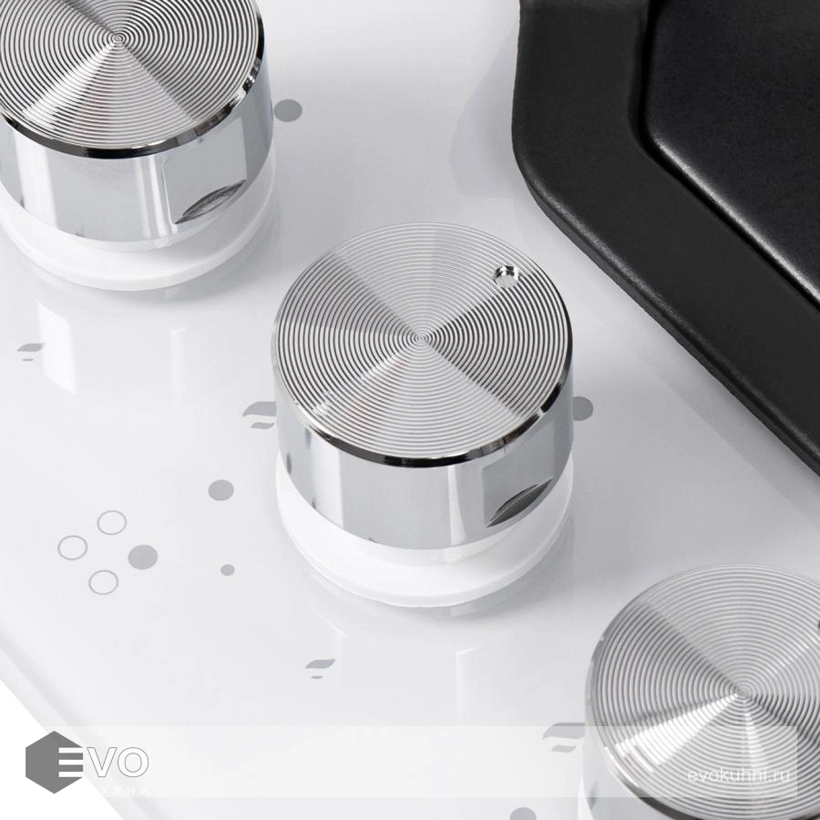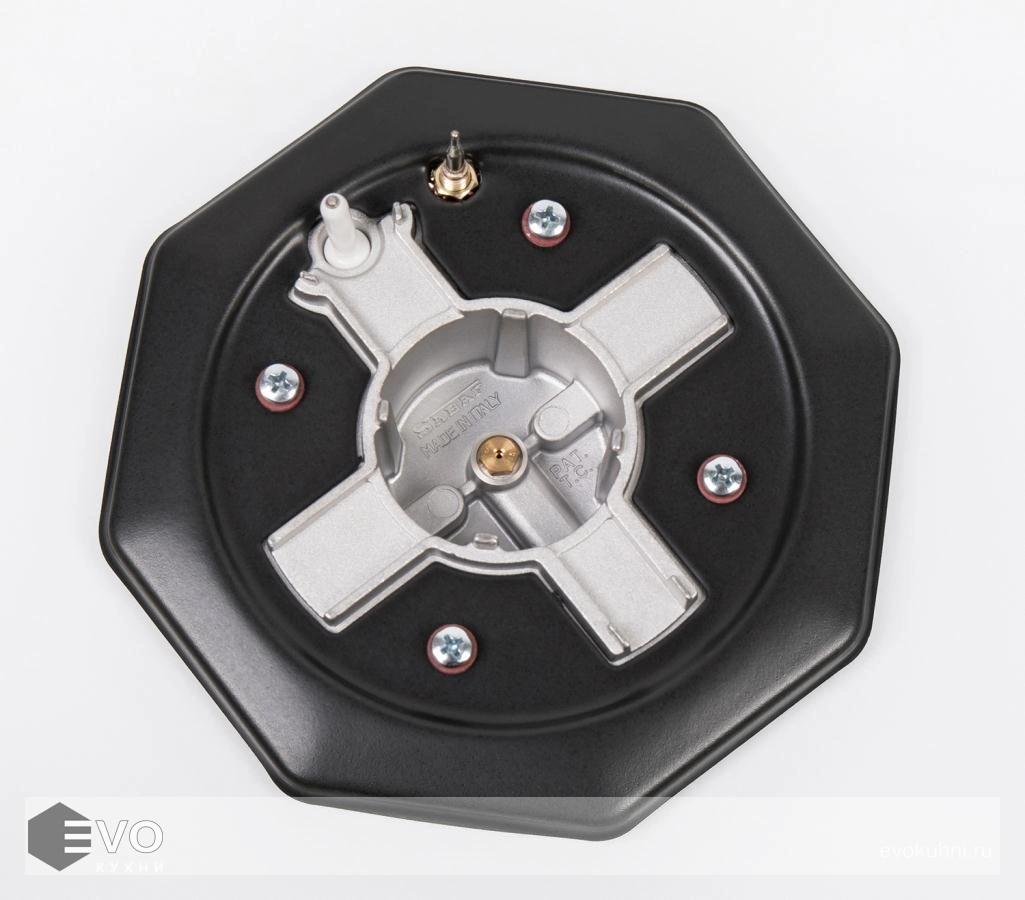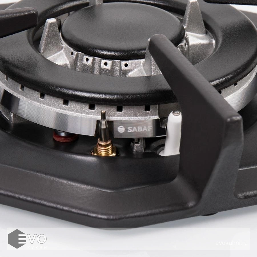 В данной модели установлены высококачественные итальянские горелки «Sabaf». Три стандартные конфорки мощностью 1000 Вт, 1700 Вт, 1700 Вт и одна мощная WOK-конфорка с двойным пламенем мощностью 3000 Вт. Управление подачей газа и поджигом конфорок происходит с помощью поворотных регуляторов - полнотелых цельнометаллических ручек. Для простоты использования около каждой ручки нанесены информационные изображения: используемая конфорка, подача газа выключена, электроподжиг, максимальное пламя и минимальное пламя.