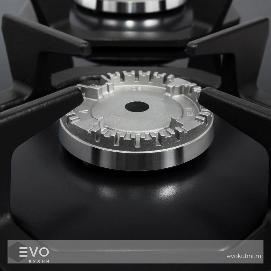 В данной модели установлены высококачественные итальянские горелки SABAF. Четыре стандартные конфорки мощностью 1000 Вт, 1700 Вт, 1700 Вт и 2600 Вт. Управление подачей газа и поджигом конфорок происходит с помощью поворотных регуляторов - полнотелых цельнометаллических ручек. Для простоты использования около каждой ручки нанесены информационные изображения: используемая конфорка, подача газа выключена, электроподжиг, максимальное пламя и минимальное пламя.