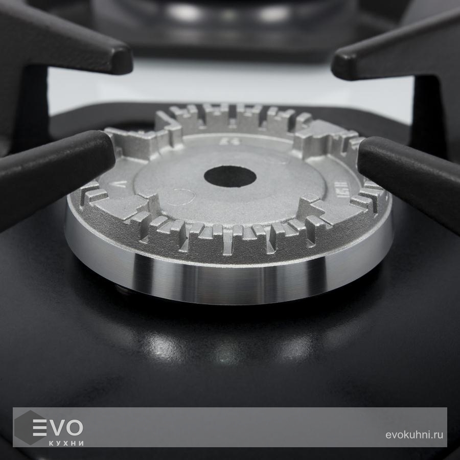 В данной модели установлены высококачественные итальянские горелки SABAF. Четыре стандартные конфорки мощностью 1000 Вт, 1700 Вт, 1700 Вт и 2600 Вт. Управление подачей газа и поджигом конфорок происходит с помощью поворотных регуляторов - полнотелых цельнометаллических ручек. Для простоты использования около каждой ручки нанесены информационные изображения: используемая конфорка, подача газа выключена, электроподжиг, максимальное пламя и минимальное пламя.