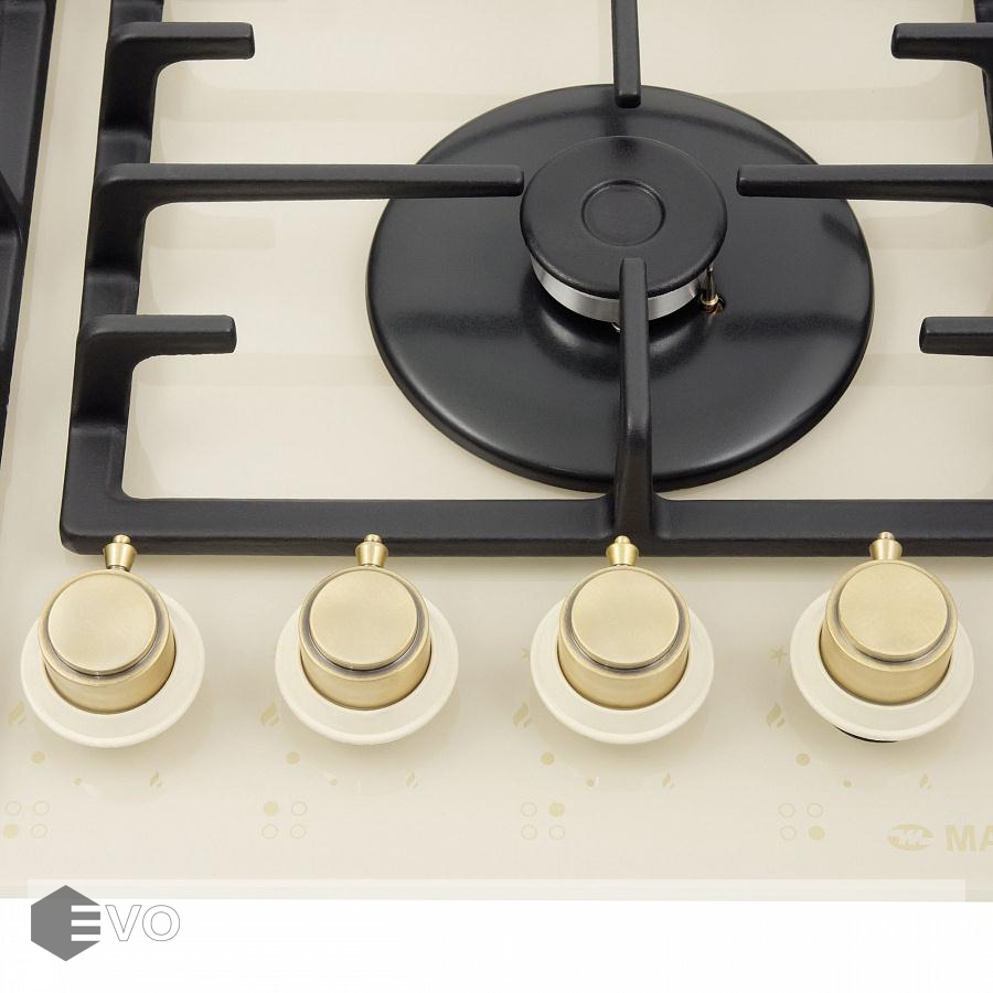 Изменение мощности нагрева и электроподжиг конфорок производится с помощью поворотных регуляторов - полнотелых цельнометаллических ручек цвета бронзы. Для простоты использования около каждой ручки нанесены информационные изображения: используемая конфорка, подача газа выключена, электроподжиг, максимальное пламя и минимальное пламя.