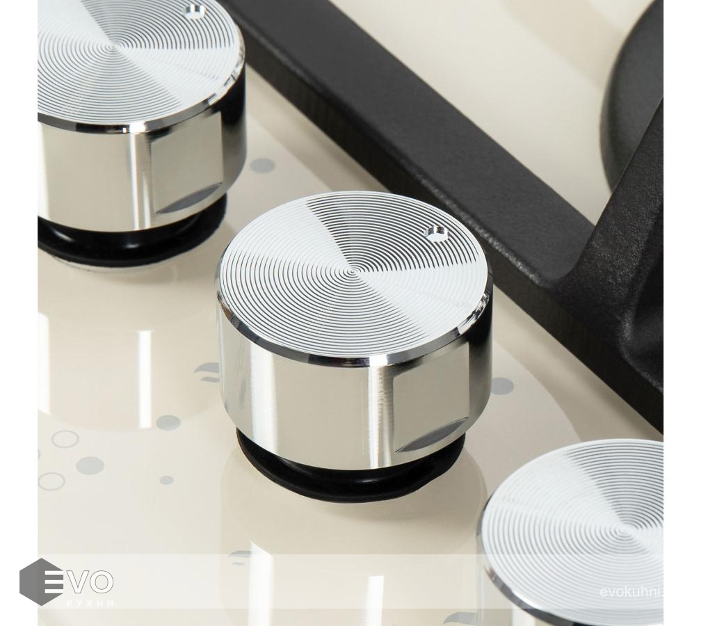 Изменение мощности нагрева и электроподжиг конфорок производится с помощью поворотных регуляторов - полнотелых цельнометаллических ручек. Для простоты использования около каждой ручки нанесены информационные изображения: используемая конфорка, подача газа выключена, электроподжиг, максимальное пламя и минимальное пламя.