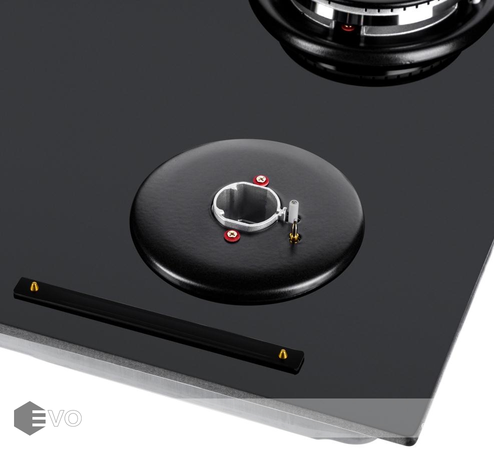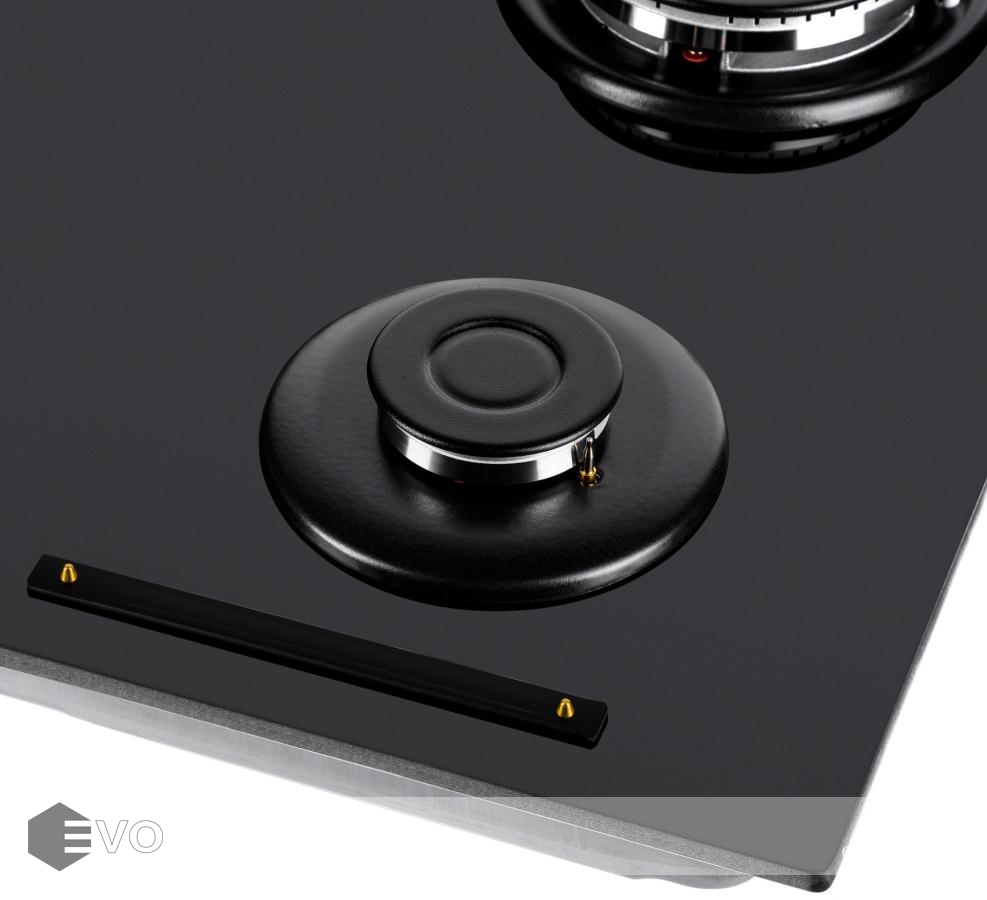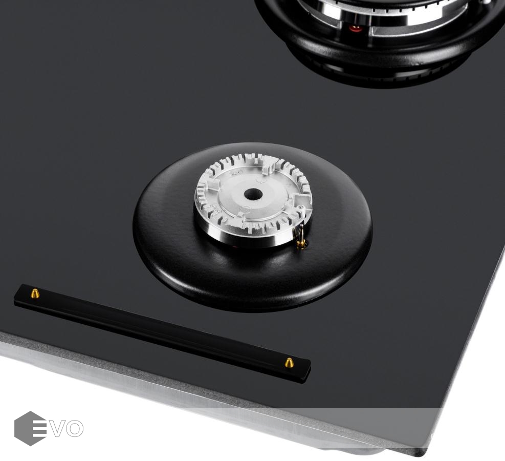 Панель выполнена из закаленного стекла толщиной 8 мм, устойчивого к царапинам, сколам и постоянным перепадам температур. В данной модели установлены высококачественные итальянские горелки SABAF. Три стандартные конфорки мощностью 1000 Вт, 1700 Вт, 1700 Вт и одна сверхмощная WOK-конфорка (3800 Вт) с двойным пламенем, спроектированные таким образом, что огонь не перегревает ни чугунные решетки, ни ручки управления.