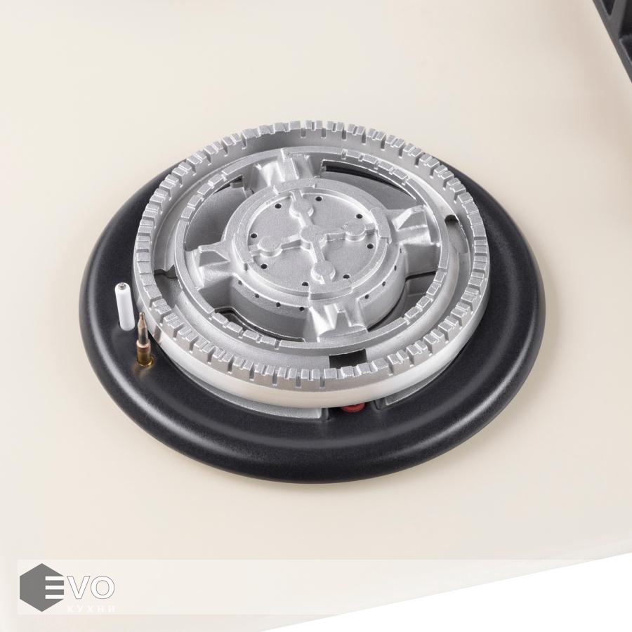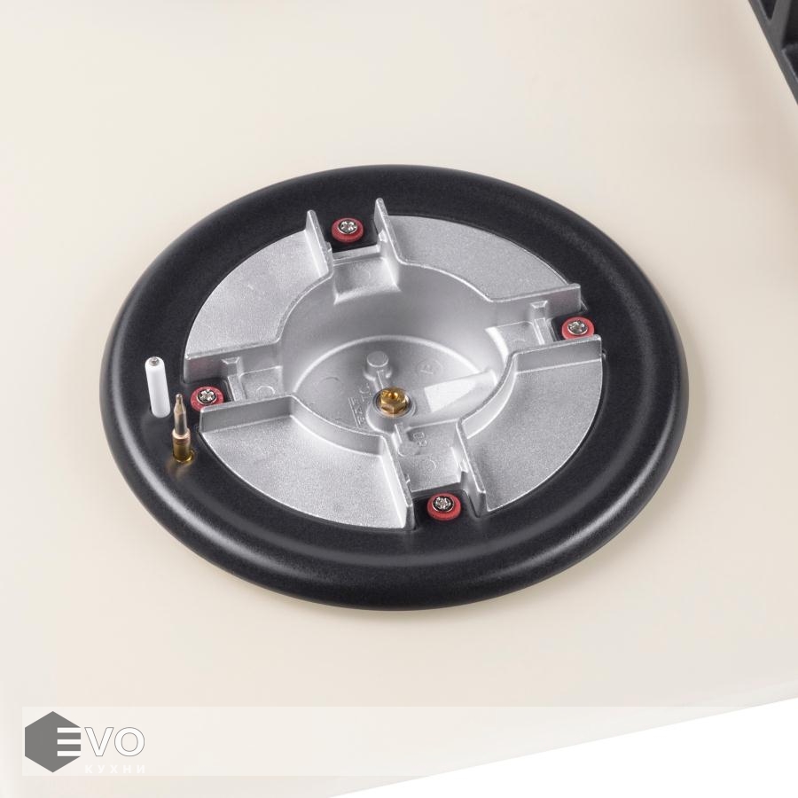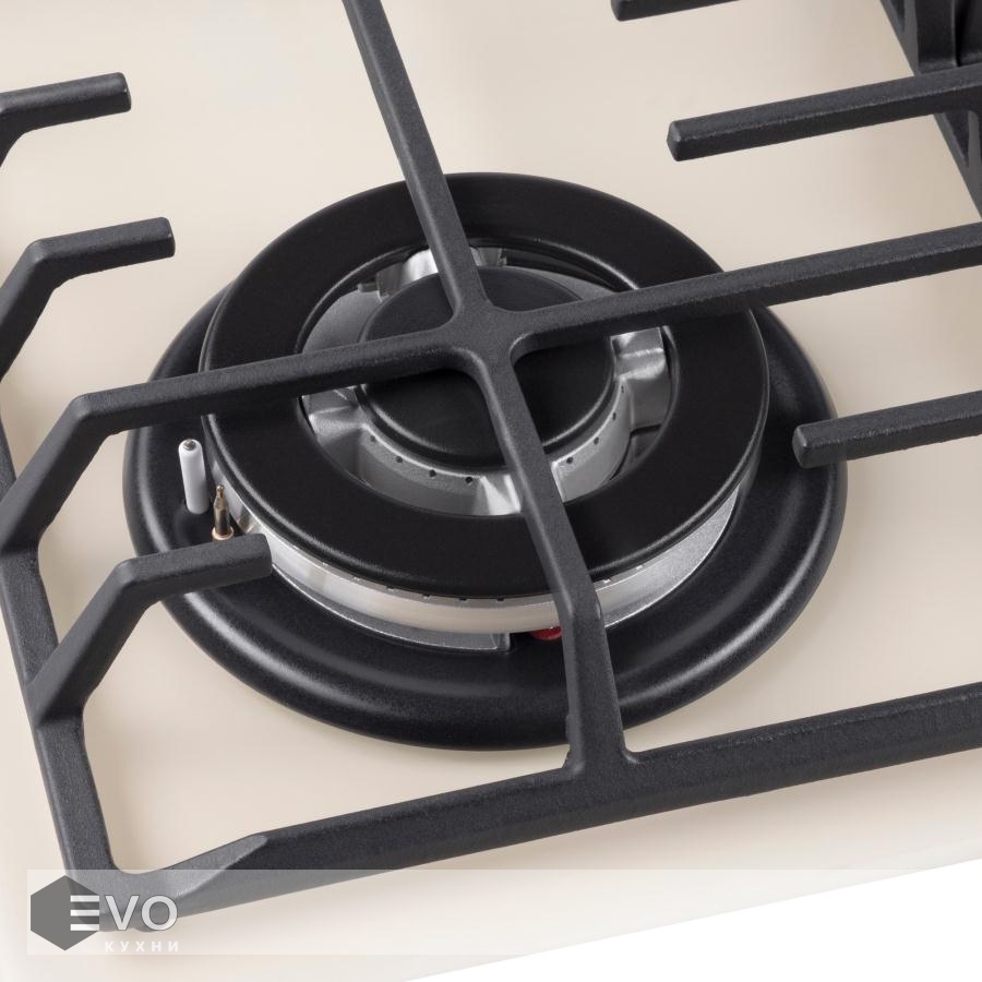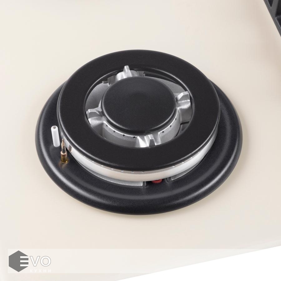 Панель выполнена из закаленного стекла, устойчивого к царапинам, сколам и постоянным перепадам температур. В данной модели установлены высококачественные итальянские горелки SABAF. Три стандартные конфорки мощностью 1000 Вт, 1700 Вт, 1700 Вт и одна сверхмощная WOK-конфорка с двойным пламенем мощностью 3800 Вт спроектированы таким образом, что огонь не перегревает ни чугунные решетки, ни ручки управления.