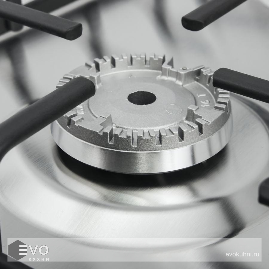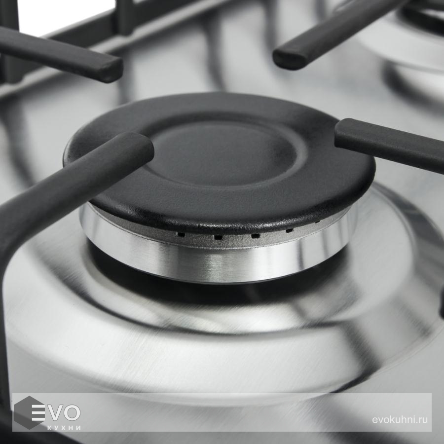 Панель изготовлена из нержавеющей стали. Модель оснащена 2 итальянскими горелками фирмы SABAF мощностью 2600 и 1700 Вт c функцией электроподжига. Над конфорками установлена матовая эмалированная решетка. Регулирование подачи газа и электоподжиг конфорок происходит с помощью поворотных ручек которые выполнены из высокопрочного термостойкого пластика.