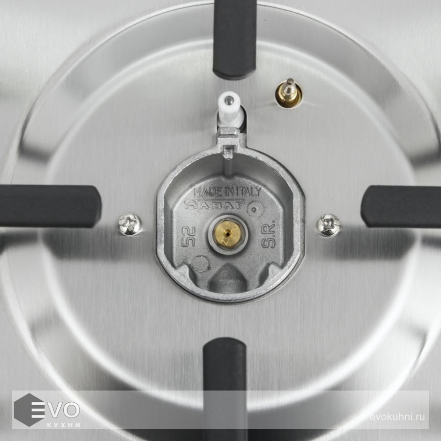 Панель изготовлена из узорчатой нержавеющей стали. Модель оснащена 2 итальянскими горелками фирмы SABAF мощностью 2600 и 1700 Вт c функцией электроподжига. Над конфорками установлена матовая эмалированная решетка. Регулирование подачи газа и электоподжиг конфорок происходит с помощью поворотных ручек которые выполнены из высокопрочного термостойкого пластика.