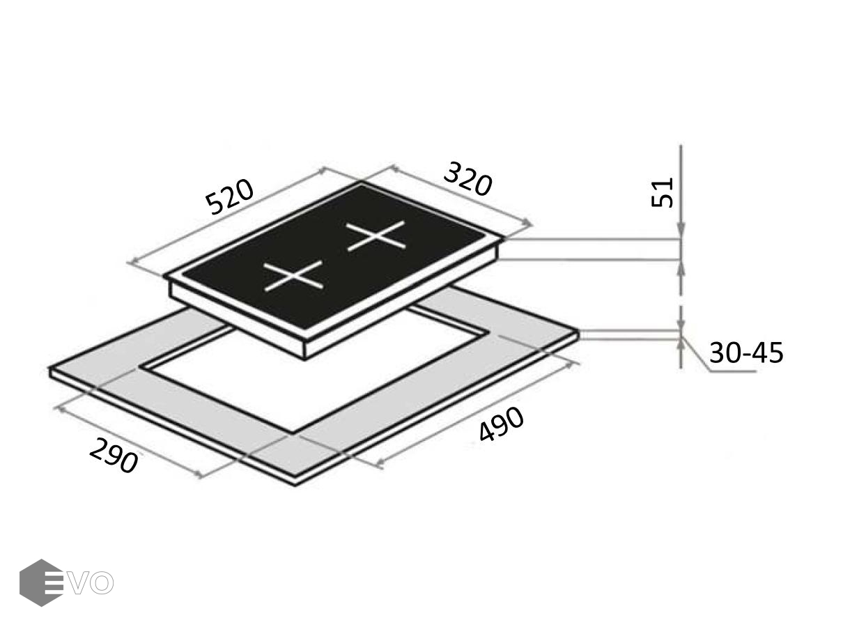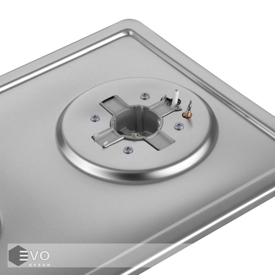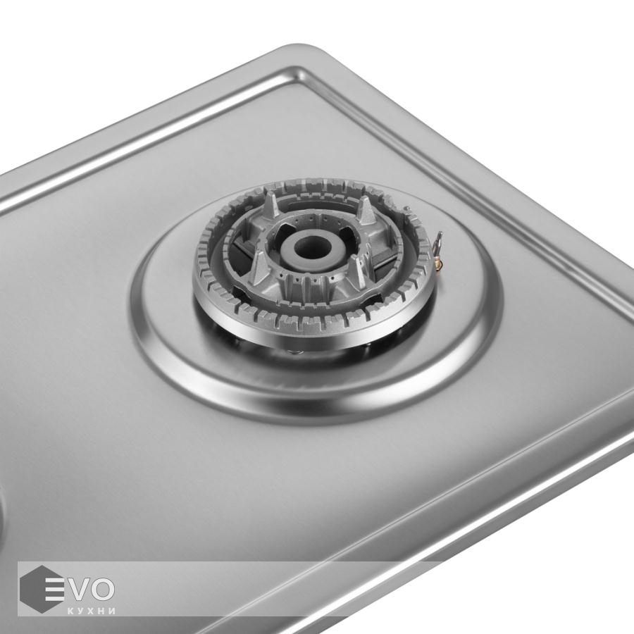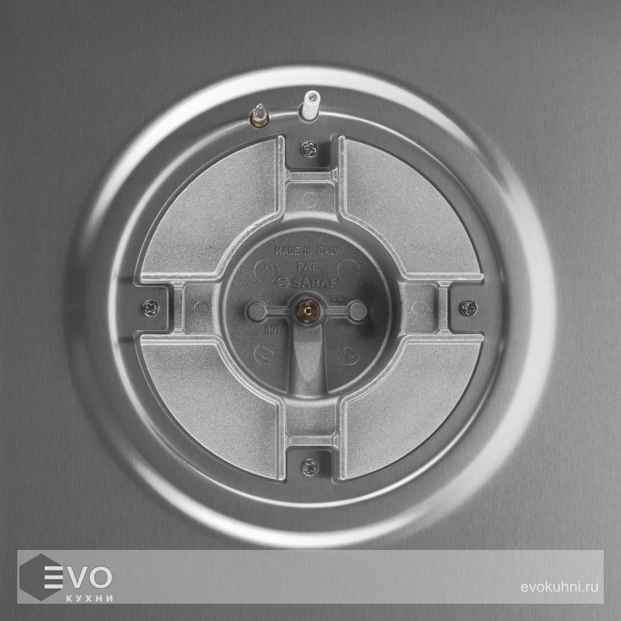 Панель выполнена из нержавеющей стали. В данной модели установлены высококачественные итальянские горелки «Sabaf». Одна стандартная конфорка мощностью 1700 Вт и одна WOK-конфорка двойным пламенем мощностью 3000 Вт. Чугунная решетка имеет крестообразные соединения над конфорками, что позволяет готовить в посуде разного диаметра, не используя специальные подставки.