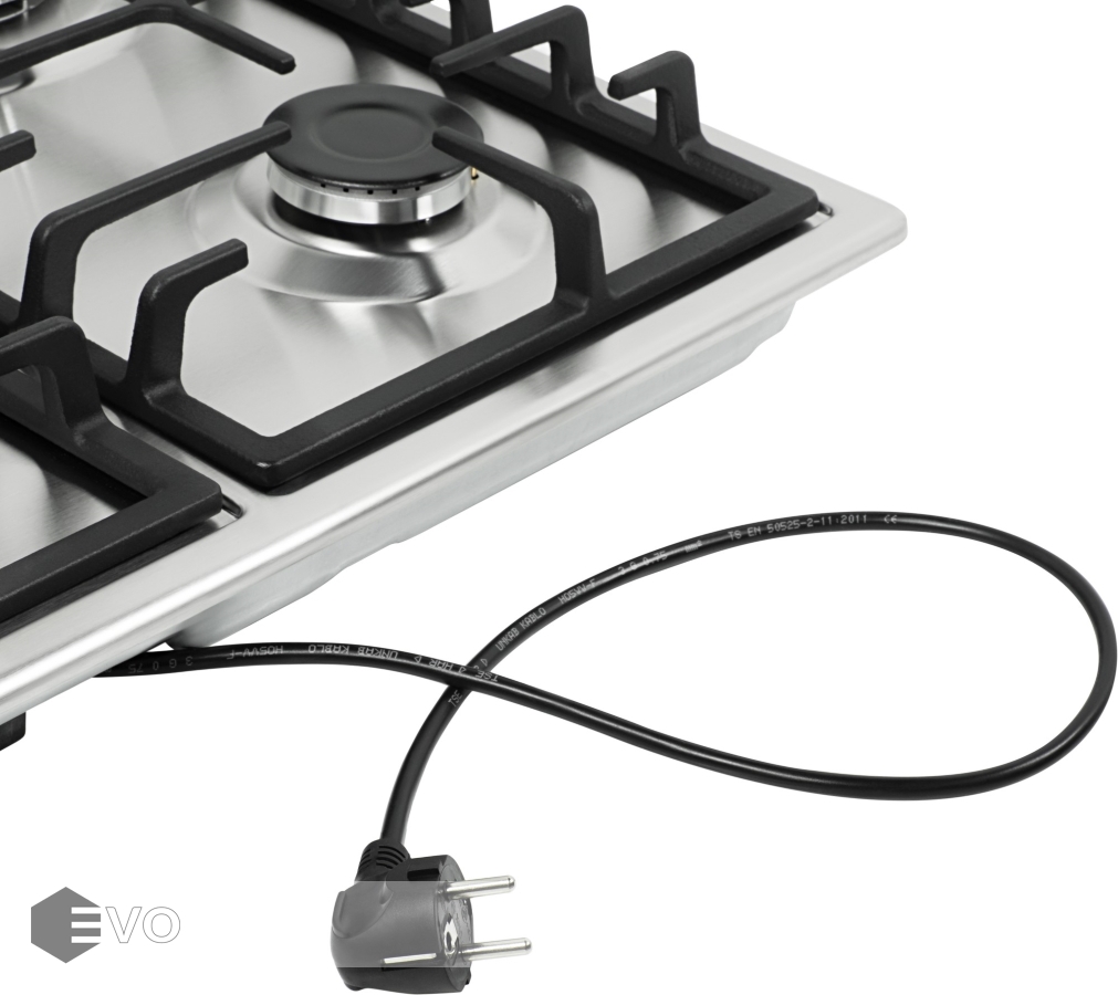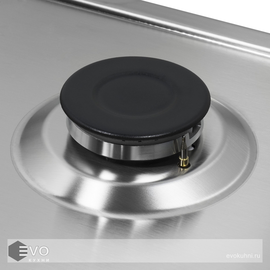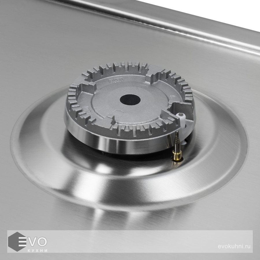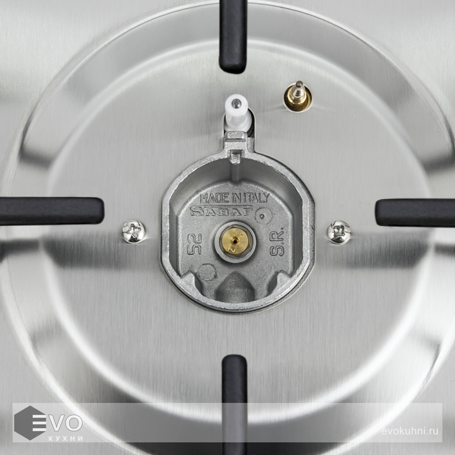 Панель выполнена из нержавеющей стали. В данной модели установлены высококачественные итальянские горелки SABAF. Четыре стандартные конфорки разного диаметра с мощностью 1000 Вт, 1700 Вт, 1700 Вт и 2600 Вт спроектированы таким образом, что огонь не перегревает ни решетки, ни ручки управления.