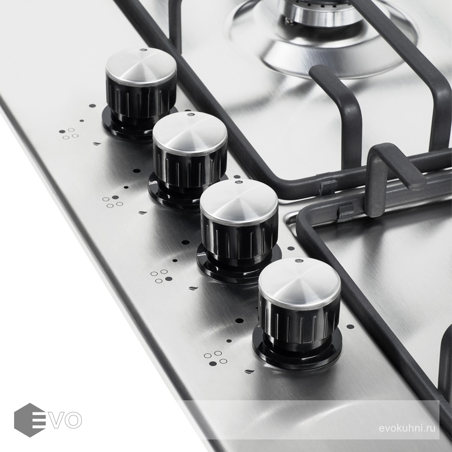 Панель выполнена из нержавеющей стали. В данной модели установлены высококачественные итальянские горелки SABAF. Четыре стандартные конфорки разного диаметра с мощностью 1000 Вт, 1700 Вт, 1700 Вт и 2600 Вт спроектированы таким образом, что огонь не перегревает ни решетки, ни ручки управления.