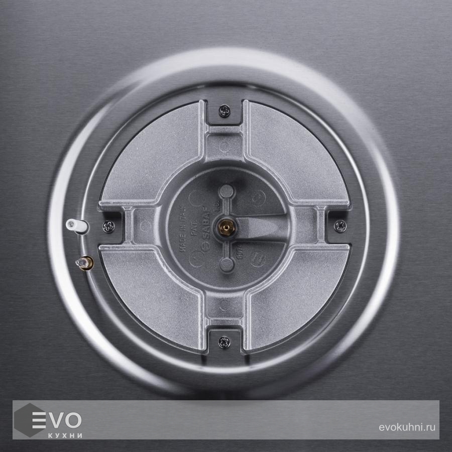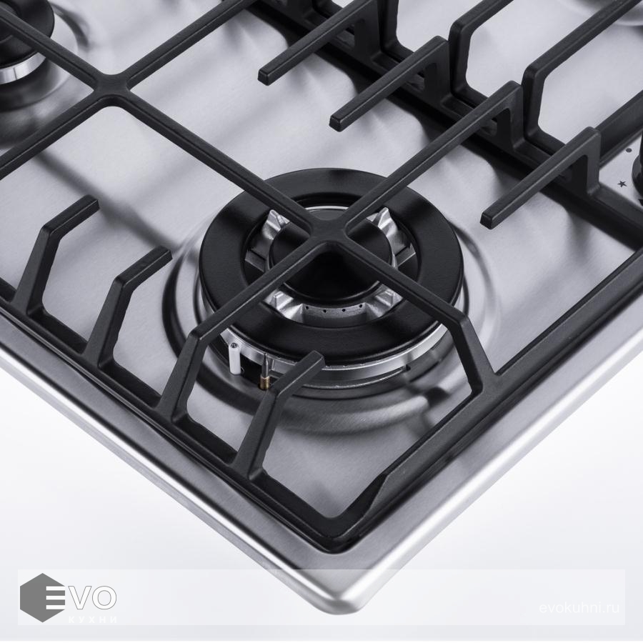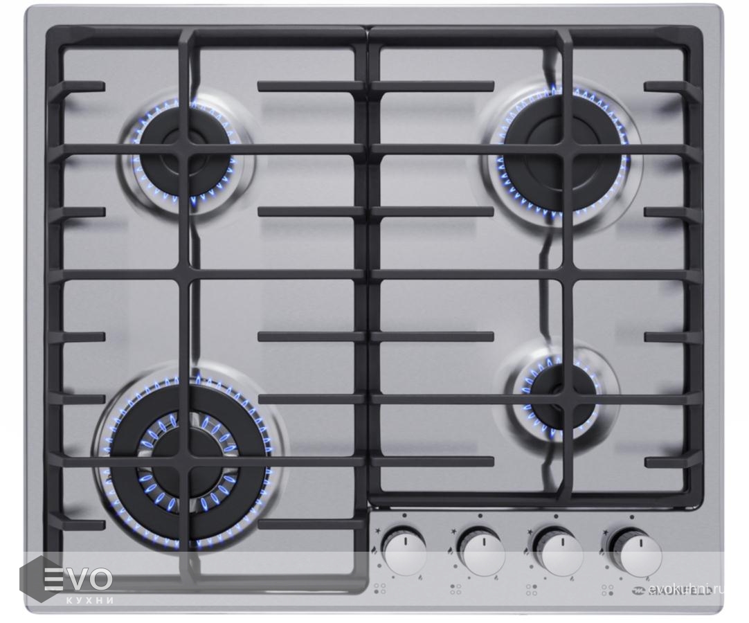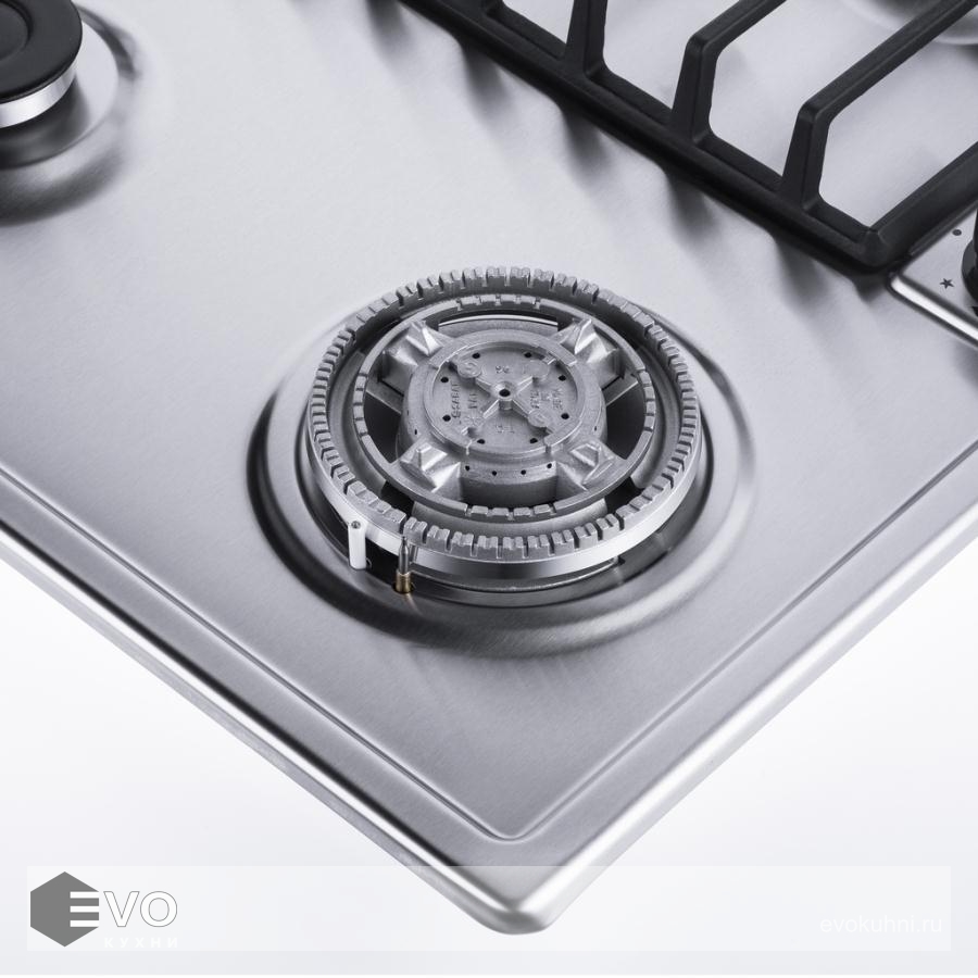 Панель выполнена из нержавеющей стали. В данной модели установлены высококачественные итальянские горелки SABAF. Три стандартные конфорки мощностью 1000 Вт, 1700 Вт, 1700 Вт и одна мощная WOK-конфорка с двойным пламенем мощностью 3800 Вт спроектированы таким образом, что огонь не перегревает ни чугунные решетки, ни ручки управления.