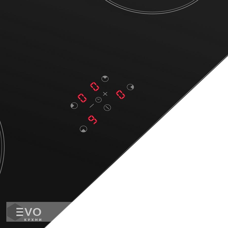 Сенсорное управление, расположенное на фронтальной поверхности, дает возможность: выбрать уровень мощности для каждой конфорки (9 уровней), выставить таймер (для отключения одной или нескольких варочных зон по истечении заданного времени), заблокировать панель от детей.