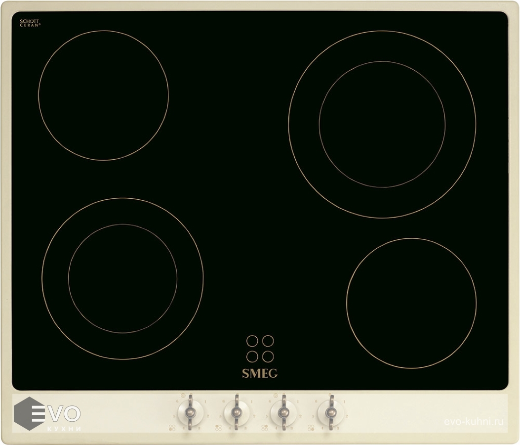 Электрическая варочная панель SMEG P864PO — панель в стиле ретро, выполнена из черной стеклокерамики, выбор режимов регулируется поворотными переключателями, выбор интенсивности нагрева производится по 6 ступеням. Индикация остаточного тепла информирует, что температура конфорки выше 60°C и ее можно использовать для подогрева готовых блюд, или для растапливания масла, шоколада.