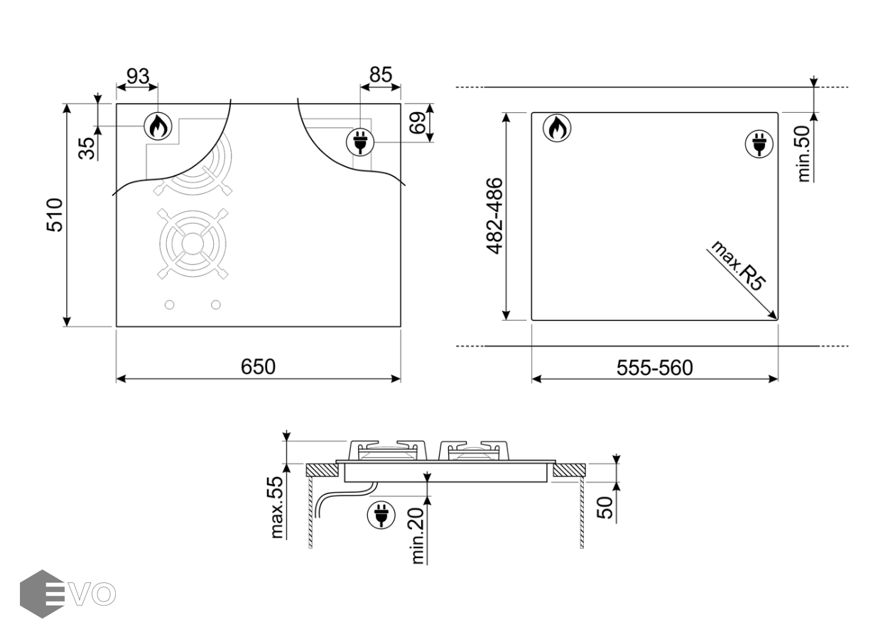 Две газовые конфорки с функцией автоматического электроподжига, а также функцией «Газ-контроль»: 1 большая, 1 малая, управление осуществляется при помощи поворотных регуляторов. Две индукционные варочные зоны с функцией BOOSTER и одной Multizone, их расположение ясно показано продольными линиями, а тепло ограничено начерченным на стекле периметром.
