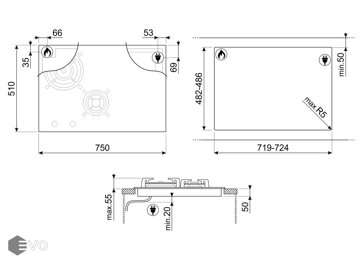 Две газовые конфорки с функцией автоматического электроподжига, а также функцией «Газ-контроль»: 1 большая, 1 малая, управление осуществляется при помощи поворотных регуляторов. Две индукционные варочные зоны с функцией BOOSTER и одной Multizone, их расположение ясно показано продольными линиями, а тепло ограничено начерченным на стекле периметром.