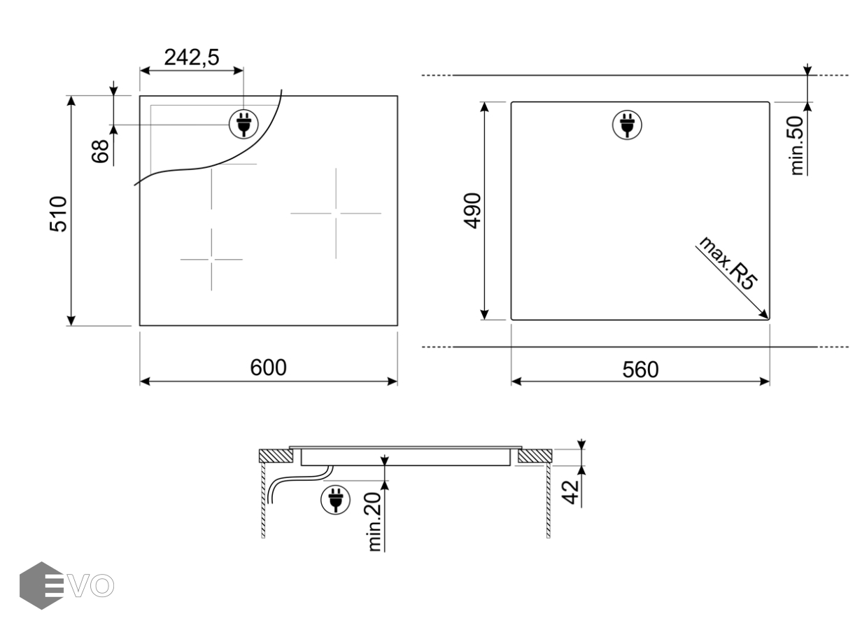 - Правая конфорка, диаметр мм/кВт: 150-216-288/ 1.05-1.95-2.7