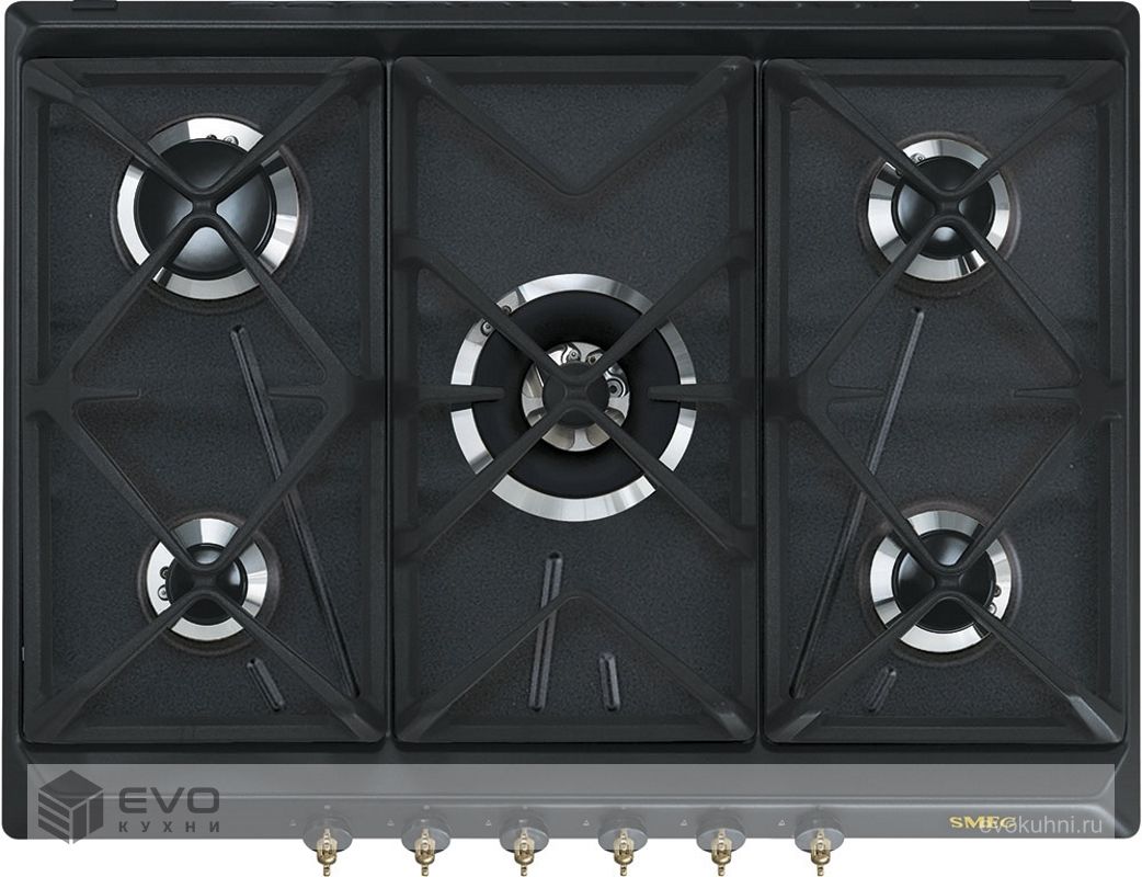 Газовая варочная панель SMEG SRV876AOGH – газовая варочная поверхность из эмалированной стали предназначена для домашнего применения (приготовление и нагрев блюд). Установка возможна на различные жаростойкие материалы. Имеет пять конфорок с функцией автоматического электроподжига: 1 маленькая, 2 средние, 1 большая, 1 WOK. Управление осуществляется при помощи поворотных регуляторов.