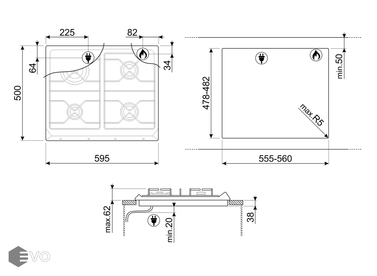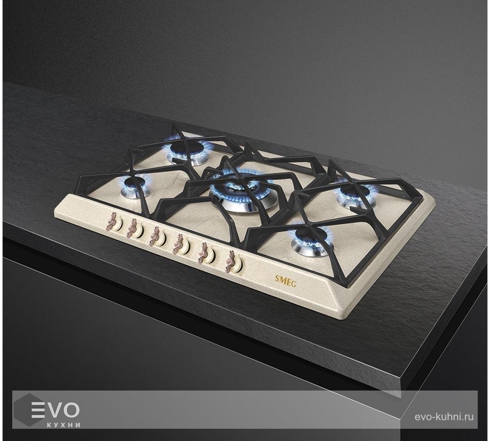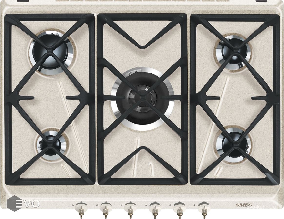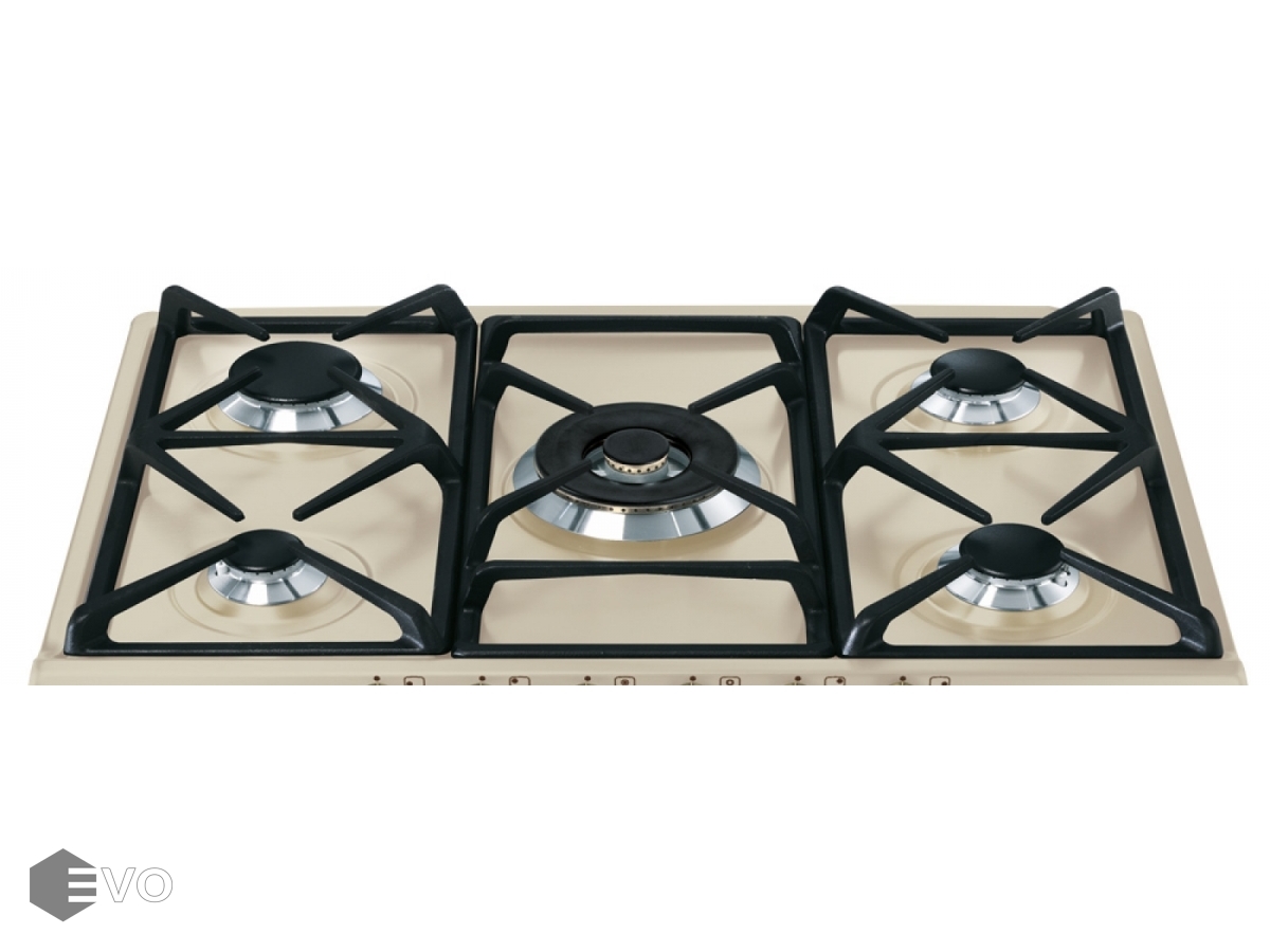 Газовая варочная панель SMEG SRV876AVOGH2 – газовая варочная поверхность из эмалированной стали предназначена для домашнего применения (приготовление и нагрев блюд). Установка возможна на различные жаростойкие материалы. Имеет пять конфорок с функцией автоматического электроподжига: 1 маленькая, 2 средние, 1 большая, 1 WOK. Управление осуществляется при помощи поворотных регуляторов.