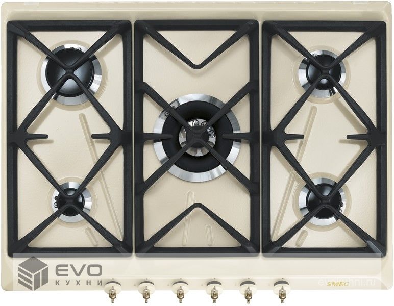 Газовая варочная панель SMEG SRV876POGH – газовая варочная поверхность из эмалированной стали предназначена для домашнего применения (приготовление и нагрев блюд). Установка возможна на различные жаростойкие материалы. Имеет пять конфорок с функцией автоматического электроподжига: 1 маленькая, 2 средние, 1 большая, 1 WOK. Управление осуществляется при помощи поворотных регуляторов.