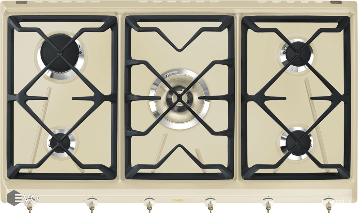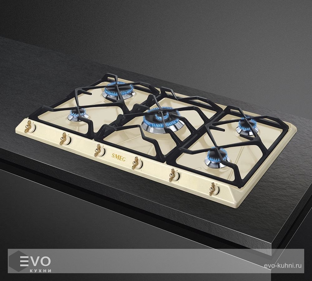 Газовая варочная панель SMEG SRV896POGH – газовая варочная поверхность из эмалированной стали предназначена для домашнего применения (приготовление и нагрев блюд). Установка возможна на различные жаростойкие материалы. Имеет пять конфорок с функцией автоматического электроподжига: 1 маленькая, 2 средние, 1 большая, 1 WOK. Управление осуществляется при помощи поворотных регуляторов.