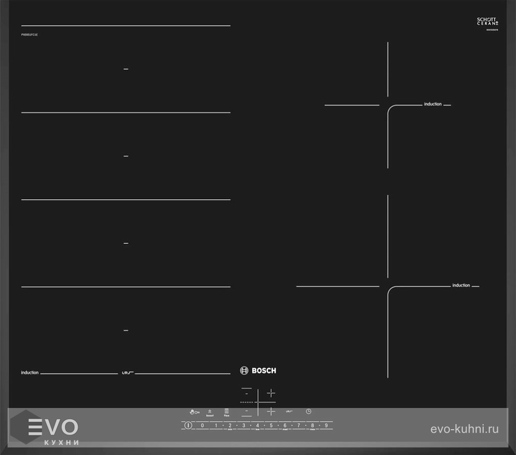Варочная панель Bosch PXE651FC1E оснащена функцией FlexInduction, она позволяет объединить две зоны нагрева в одну. Блокировки от детей защитит от случайного нажатия. 17 ступеней мощности помогут в точном регулирование температуры.