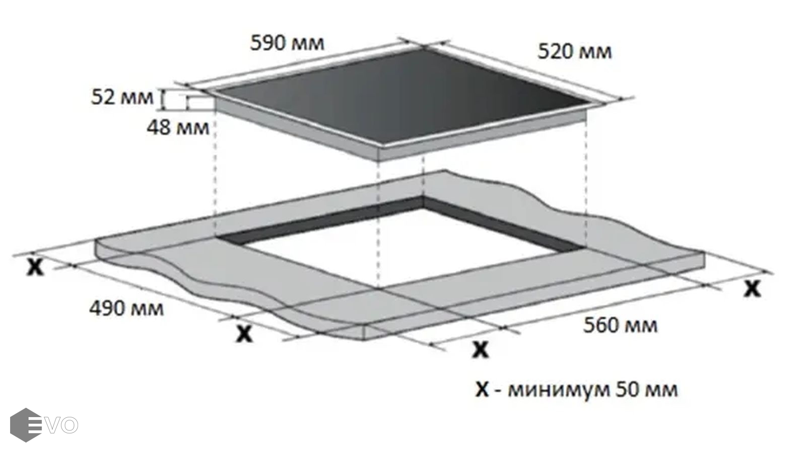 | Размеры встраивания (ВхШхГ), мм: | 48х560х490 мм |