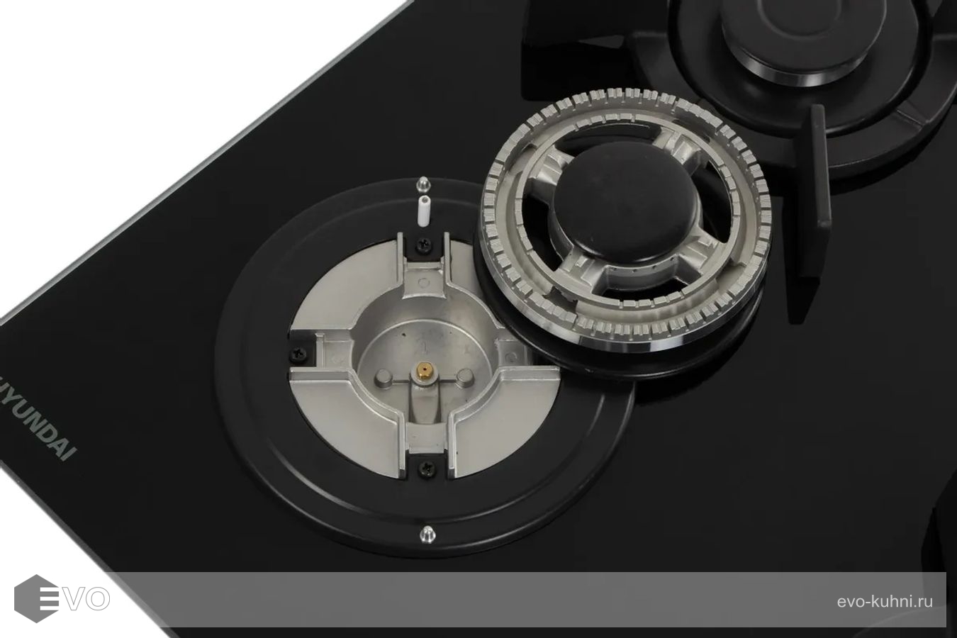 - Левая ближняя конфорка газовая, мощность 3500 Вт, двухконтурная