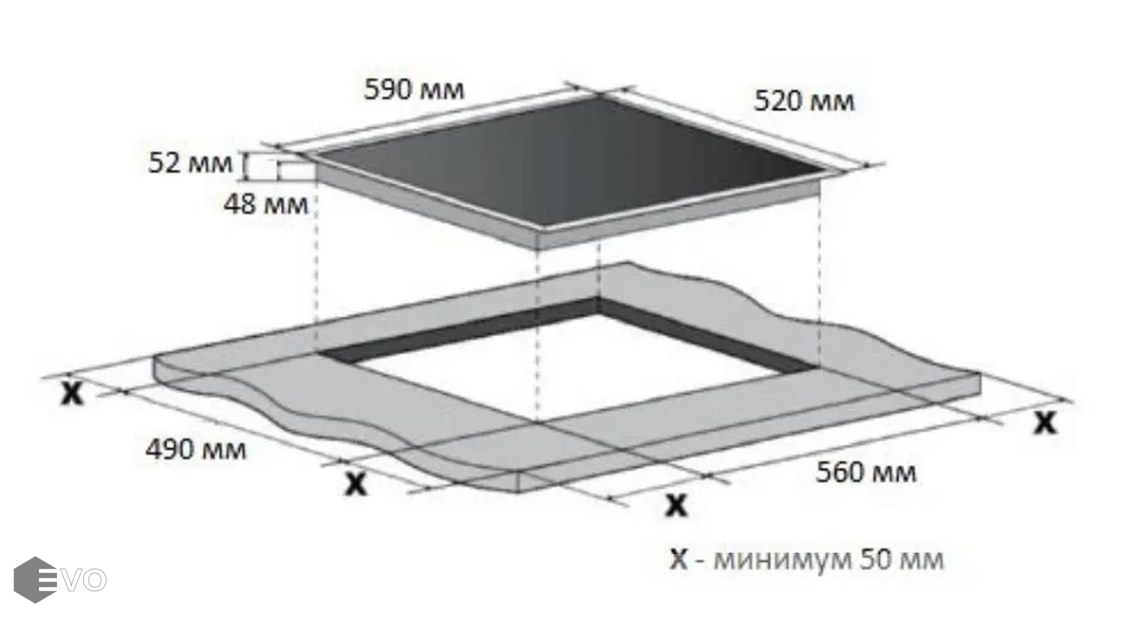 | Размеры встраивания (ВхШхГ), мм: | 52х560х490 мм |
