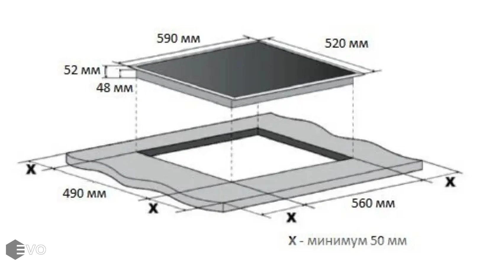 - Размеры ниши для встраивания (ШхВxГ) 560x52х490 мм