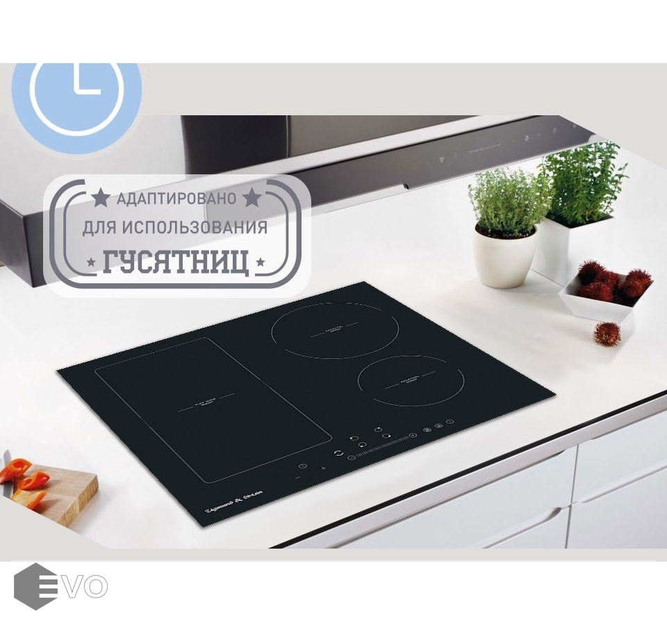 Индукционная варочная поверхность Zigmund & Shtain CI 34.6 B выполнена из стеклокерамики с универсальной расцветкой и благодаря индукционной технологии обеспечивает максимум комфорта в повседневном приготовлении. Данная модель оснащена 3 зонами нагрева – прямоугольная Multizone и две круглые, которые поддерживают функцию ускоренного нагрева. Для регулировки интенсивности нагрева реализован сенсорный слайдер, а кнопки способствуют простому выбору необходимых параметров простыми прикосновениями. Поверхность из стеклокерамики черного цвета стильно смотрится в интерьере и отличается простотой в уходе благодаря легкой очистке. Среди прочих особенностей модели Zigmund & Shtain CI 34.6 B отмечаются визуализация остаточного тепла, защита от перелива, функция паузы, таймер конфорок и блокировка панели управления.