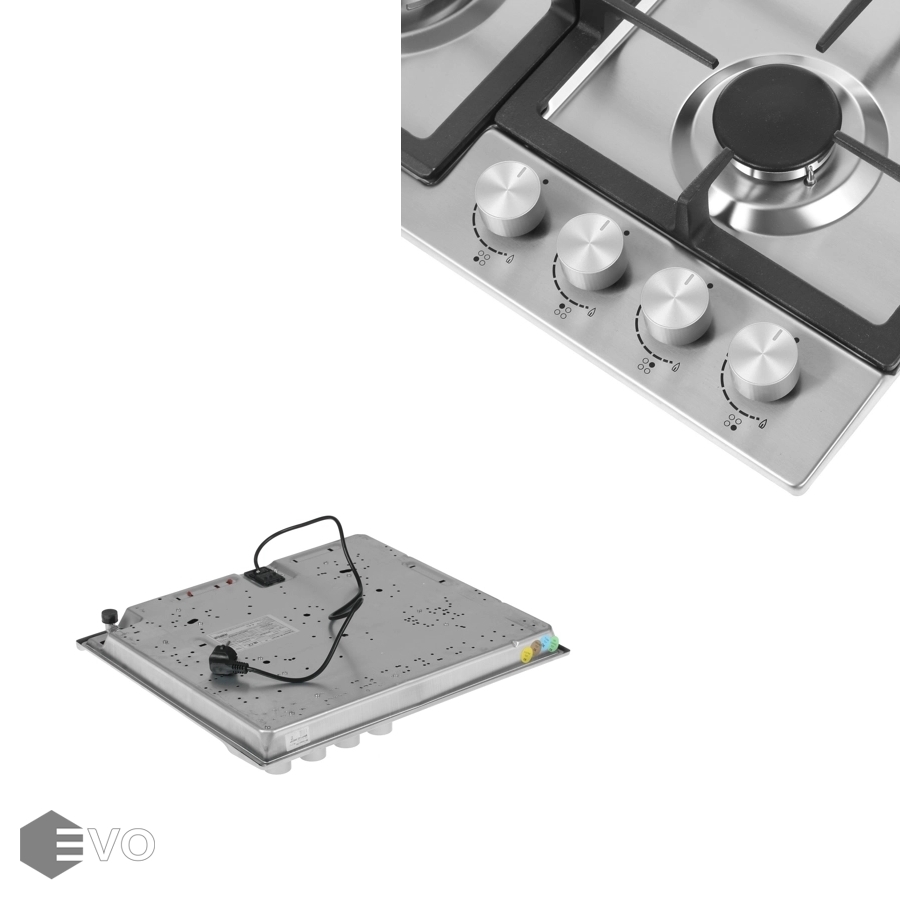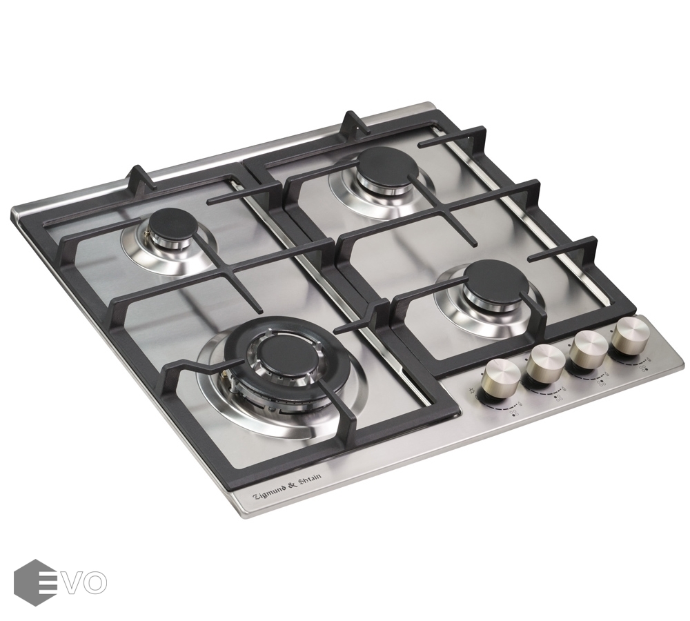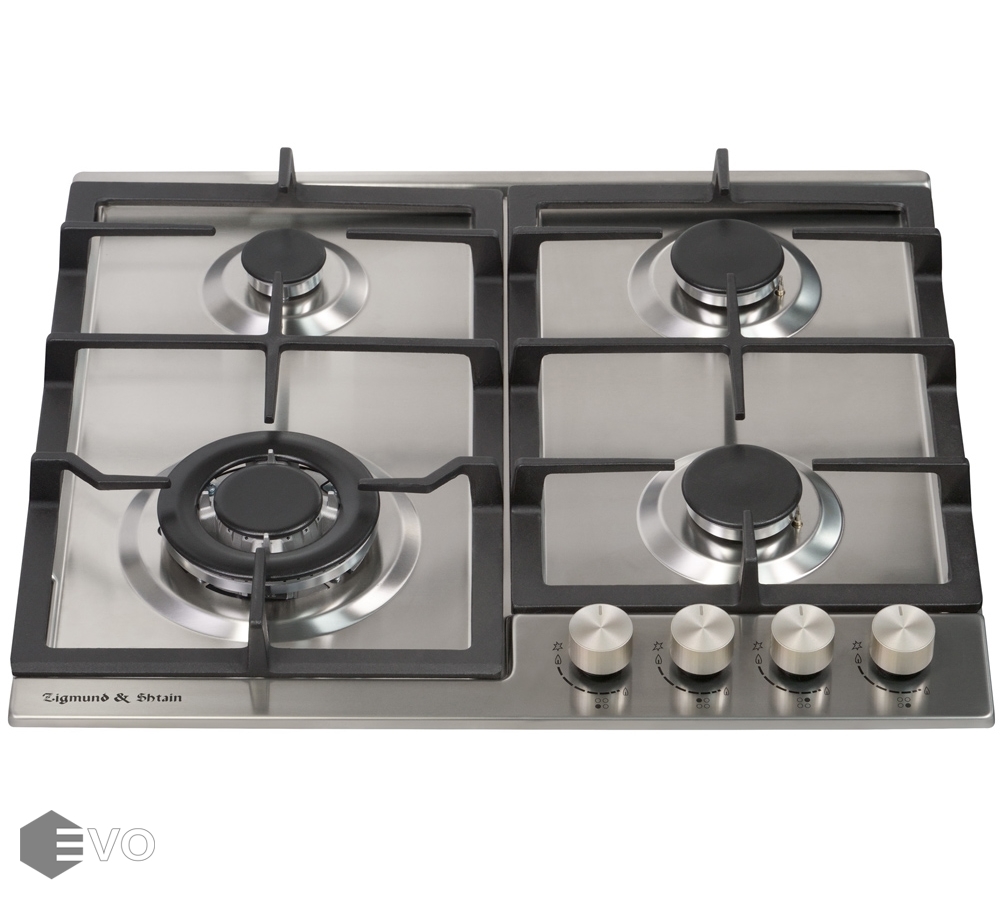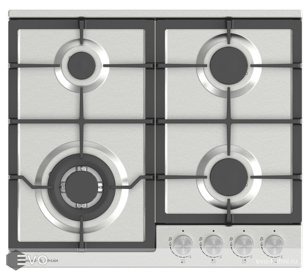 Встраиваемая газовая варочная панель с 4 конфорками. Две чугунные решетки. Переключатели с электроподжигом. WOK-горелка мощностью 3800 Вт. Каждая конфорка оснащена устройством контроля наличия пламени (газконтроль), которое останавливает подачу газа в случае исчезновения пламени.