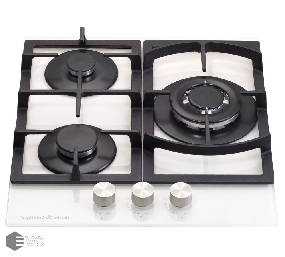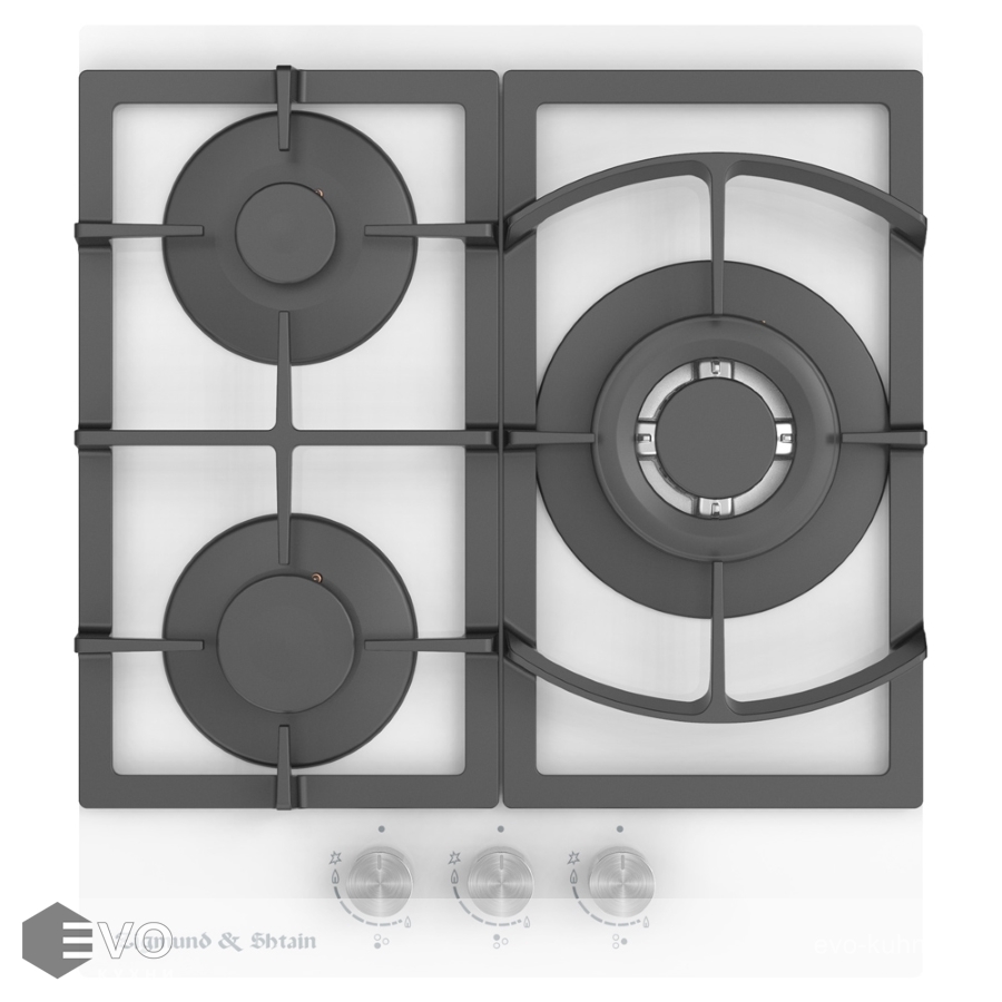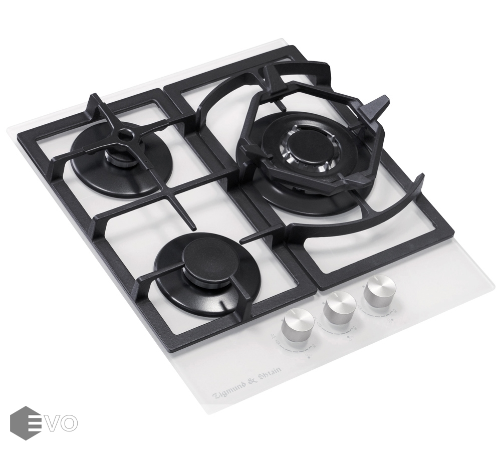 Встраиваемая газовая варочная панель с 3 конфорками. Две чугунные решетки. Переключатели с электроподжигом. WOK-горелка мощностью 3800 Вт. Каждая конфорка оснащена устройством контроля наличия пламени (газконтроль), которое останавливает подачу газа в случае исчезновения пламени.