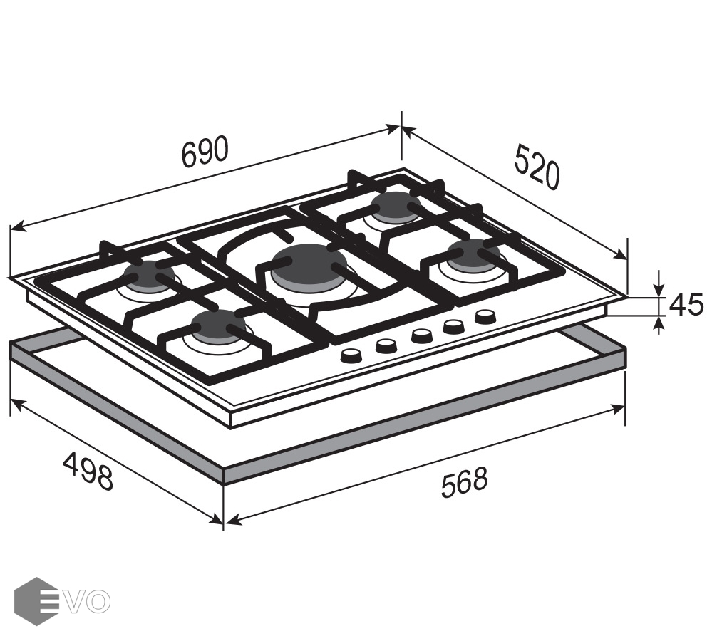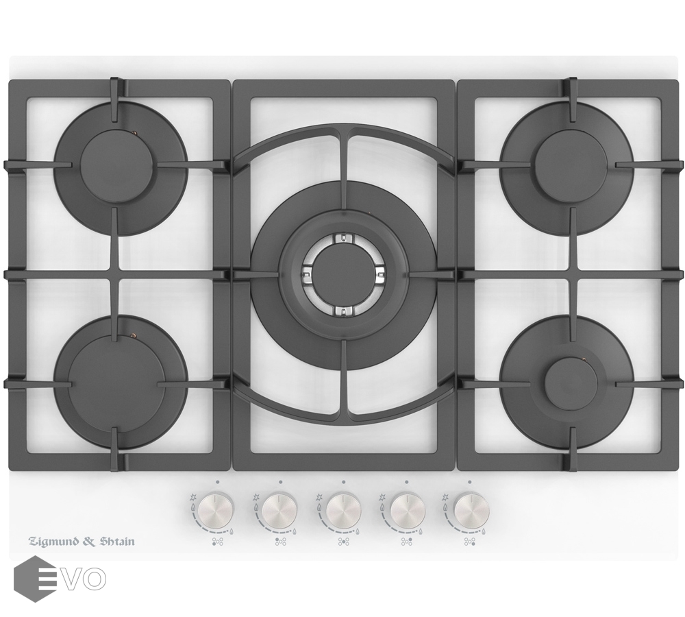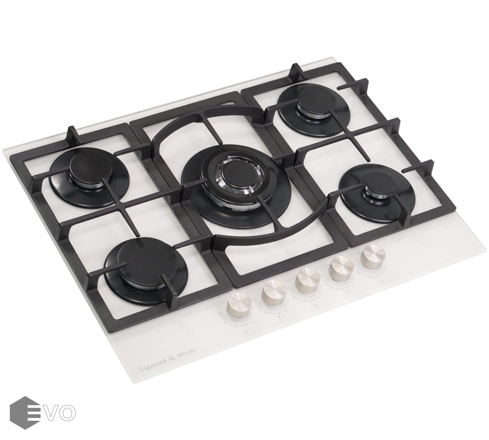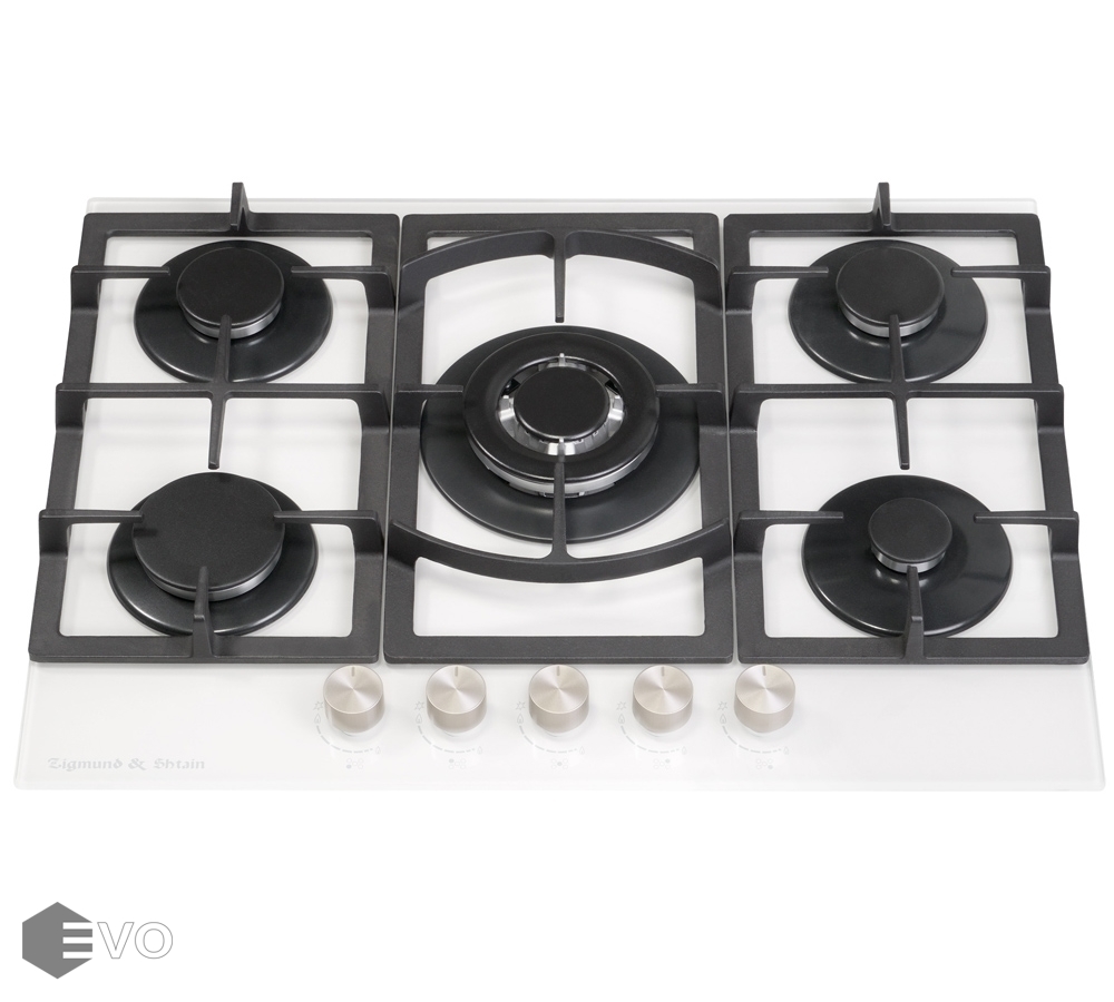Встраиваемая газовая варочная панель с 5 конфорками. Три чугунные решетки. Переключатели с электроподжигом. WOK-горелка мощностью 3800 Вт. Каждая конфорка оснащена устройством контроля наличия пламени (газконтроль), которое останавливает подачу газа в случае исчезновения пламени.