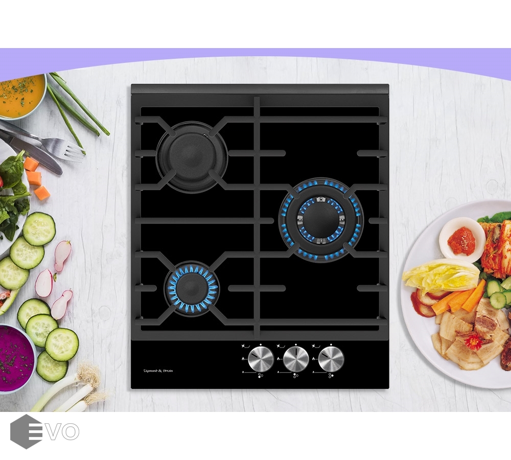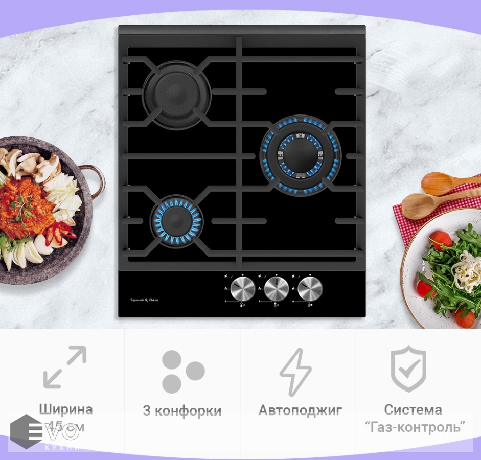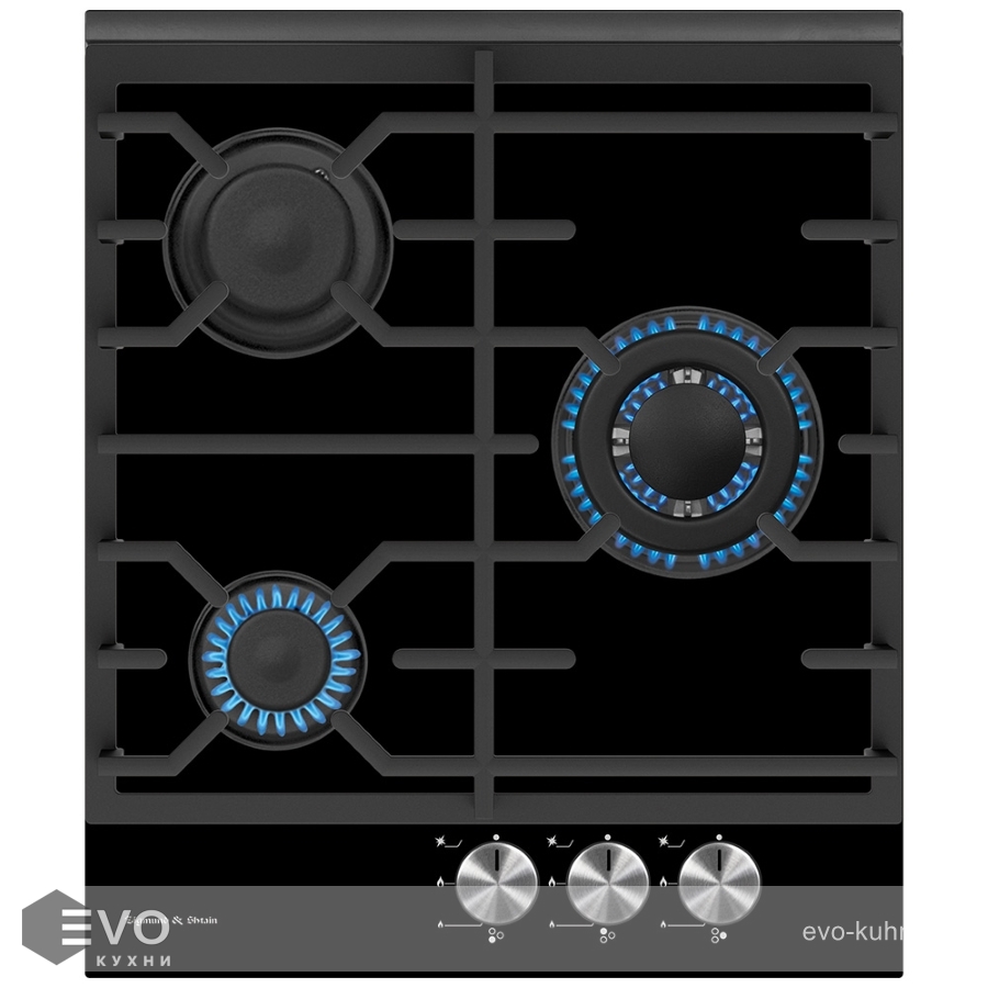 Zigmund Shtain MN 135.451 B — стильная варочная панель, изготовленная из закаленного стекла черного цвета. Модель снабжена тремя разноразмерными конфорками, одна из которых имеет три ряда пламени. Ширина 45 см позволит установить эту варочную поверхность в небольшой кухне. Модель «Газ на стекле» впишется в любую обстановку в классическом или современном стиле. Как и прочие модели из коллекции Slimline, она может встраиваться рядом с другими варочными панелями в дизайне «Домино». Расположение конфорок и поворотных регуляторов на панели управления обеспечивает полную безопасность при включении. Каждый переключатель снабжен электроподжигом, который позволяет обойтись без спичек.
