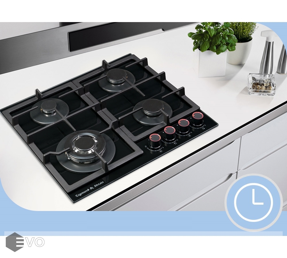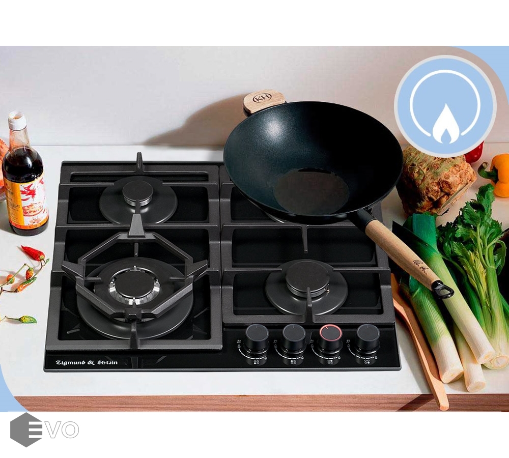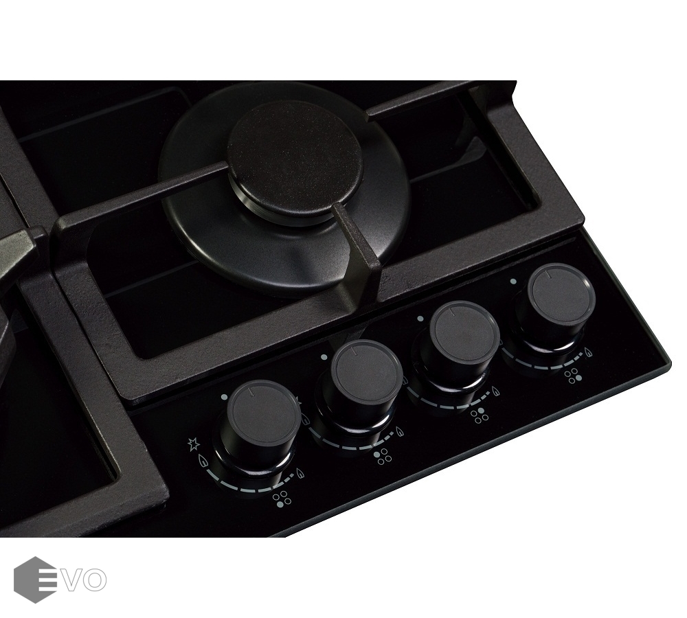 Встраиваемая газовая варочная панель с 4 конфорками. Две чугунные решетки. Переключатели с электроподжигом. WOK-горелка мощностью 3800 Вт. Каждая конфорка оснащена устройством контроля наличия пламени (газконтроль), которое останавливает подачу газа в случае исчезновения пламени.